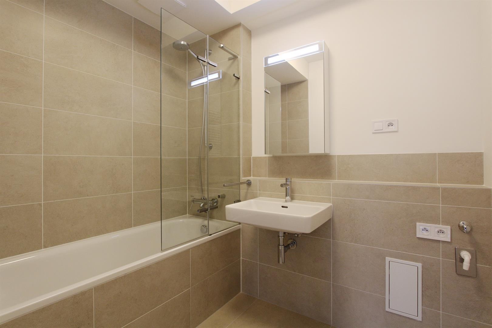 V koupelně (4 m2) je vana se sprchovou zástěnou, umyvadlo, zrcadlová skříňka, otopný žebřík a přípojka na pračku.