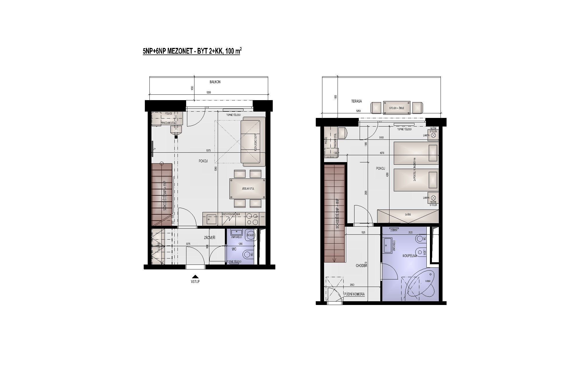 Byty 2+kk jsou o výměře od 98,2 do 100,4 m2 a nacházejí se ve 5. podlaží. Byt 3+kk má 121 m2. Budova je opatřena výtahem i schodištěm. Byt má vstupní chodbu vybavenou šatní skříní, celoplošným zrcadlem a pokojovým trezorem. Dále byt disponuje obývací částí s rozkládací sofa, moderní vybavenou kuchyňskou linkou s pracovní deskou, podstavnou lednicí indesit, vestavěnou mikrovlnou trouba s grilem a horkovzdušnou troubou, varnou konvicí a jídelní soupravou s nádobím pro 4 osoby. Pokoj je vybavený jídelním stolem se 4 židlemi, pracovním stolem s kancelářskou židlí a smart TV. Z pokoje je vstup na balkon. Ložnice je samostatná s luxusní postelí King Koil s možností uspořádání jako oddělené postele nebo manželská postel a velkou šatní skříní. Z ložnice je vstup na prostornou terasu s posezením a výhledem na Petrov a Špilberk. Koupelna v horní části je s rohovou vanou, umyvadlem, bidetem, wc a topným žebříkem.WiFi připojení se standardní rychlostí dat je již v ceně pronájmu.