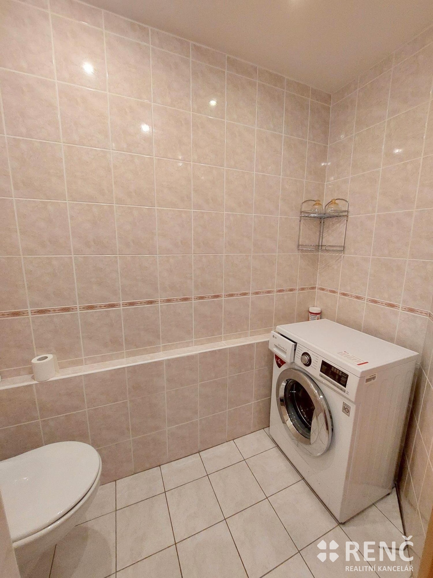 Koupelna se sprchovým koutem je společná s toaletou a je vybavená pračkou.