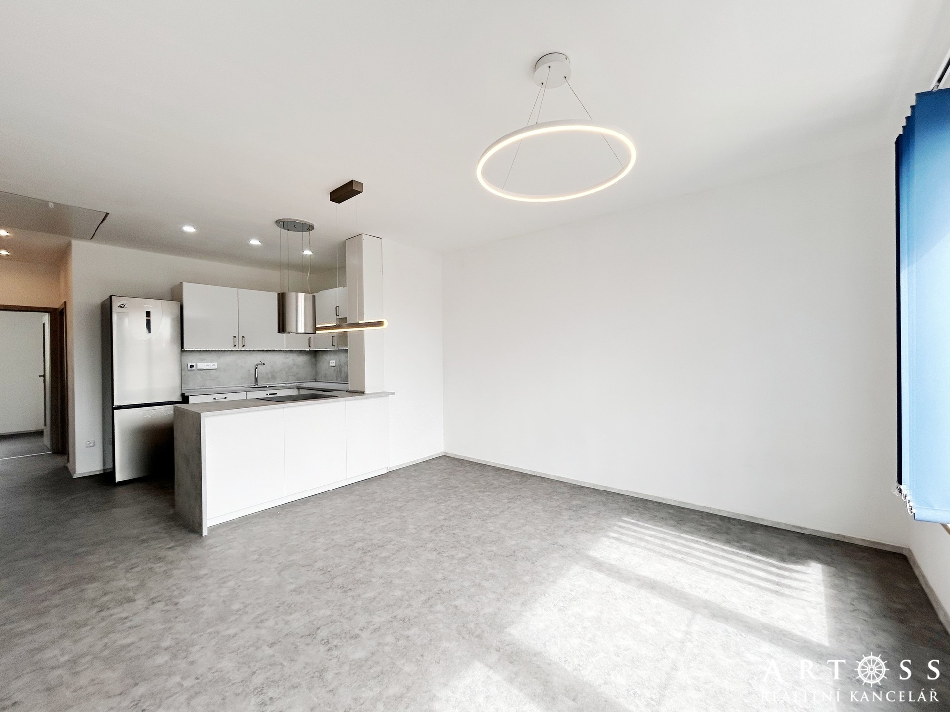 Obývací pokoj s kuchyňským koutem: 28,7 m², vybavený novou linkou se spotřebiči (trouba, myčka nádobí, varná deska, digestoř, pračka).
