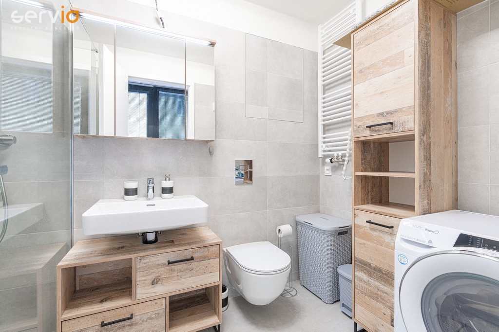 Součástí jednotky je moderně vybavená koupelna (sprcha nebo vana, WC, umyvadlo, galerka se zrcadlem, věšáky, pračka), kompletní KL včetně spotřebičů (myčka, trouba, sporák), vinylová podlaha, jídelní stůl a židle, možnost dovybavení postelí (jednolůžko, dvojlůžko), předsíňový nábytkový program, a další vybavení dle domluvy s majitelem. Ke každému bytu náleží sklep. Objekt bude zabezpečen kamerovým systémem. Volné ihned, možnost pronájmu krytého PS za poplatek 2.000,-Kč/měs + DPH. Maximální počet osob 2.