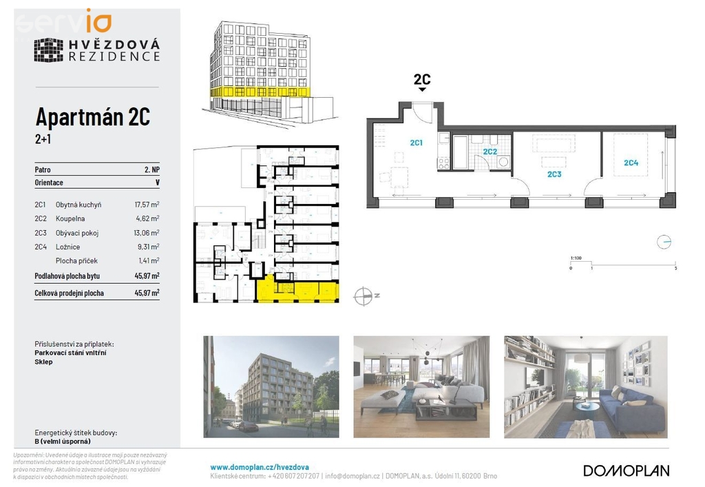Nabízíme exkluzivně pronájem bytu 2+1 o velikosti 45,97 m2 se sklepem a možností pronájmu krytého PS v objektu Rezidence Hvězdová, polyfunkční dům obklopený městským parkem, odkud je to na brněnské náměstí Svobody procházkou deset minut.