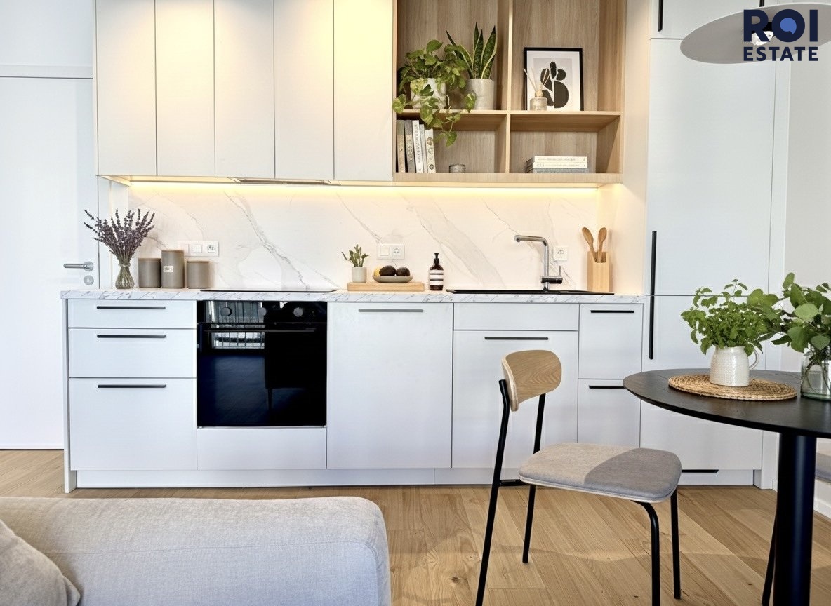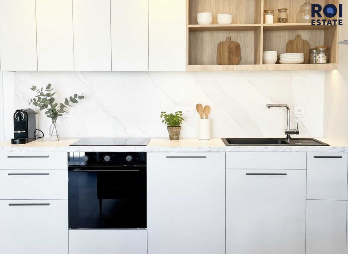 Kuchyně je moderní, nadčasová a plně vybavená – mramorová pracovní plocha, vestavné spotřebiče a praktické úložné prostory nechávají vyniknout čistému designu.