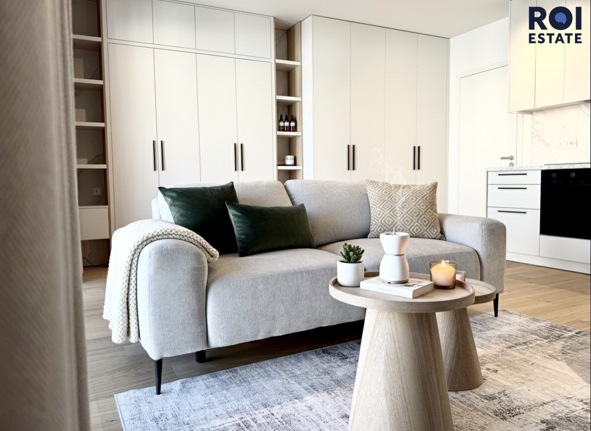 Obývací část je řešená s citem pro vzdušnost i pohodlí. Velká sedačka v jemné béžové barvě zve k odpočinku, a díky francouzským oknům proudí do místnosti přirozené světlo po celý den. Postel je velmi chytře řešena, je vyklápěcí, velmi kvalitní a je skryta v jedné ze skříní.