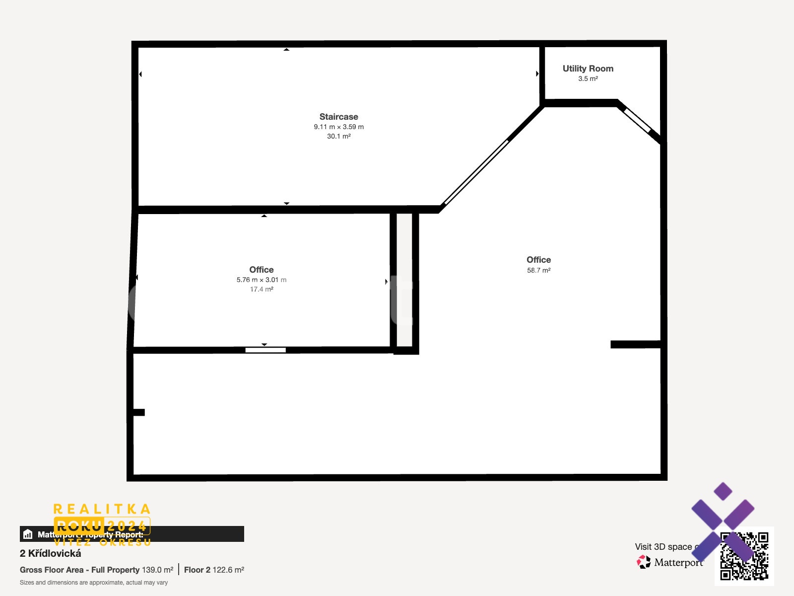 Prostory mají vlastní samostatný vstup z ulice. Ve 2. NP se rozprostírají hlavní kancelářské prostory o výměře 59 m², technická místnost (3,5 m²) a samostatná kancelář (17,4 m²).