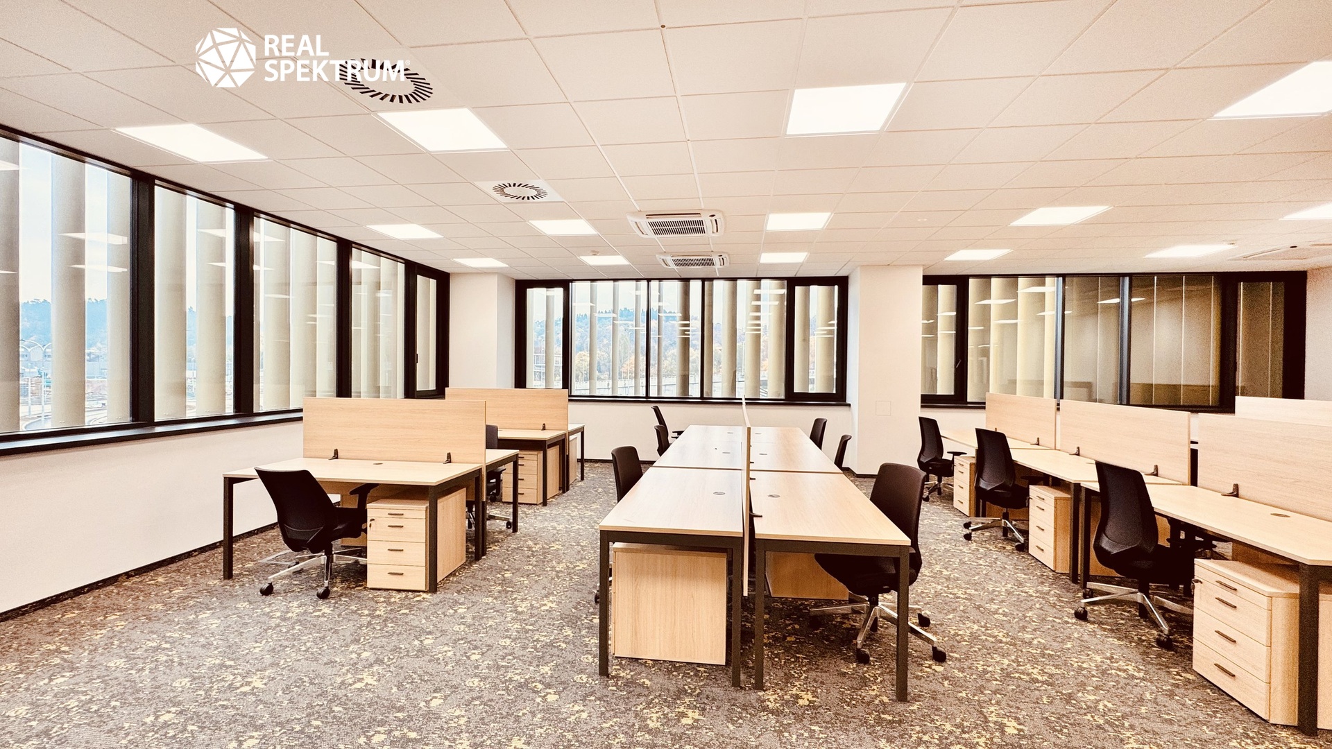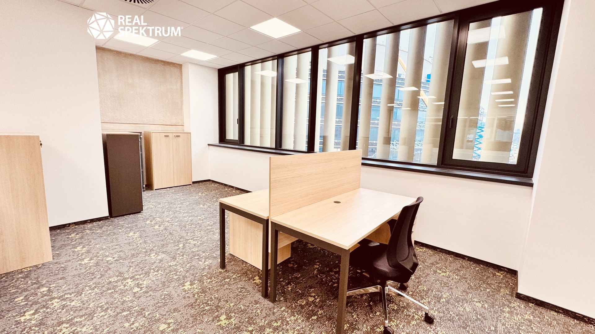 V nižším podlaží (96,69 m²) je prostor vhodný pro vstupní lobby, jednací místnost či zázemí pro zaměstnance, horní podlaží (200,36 m²) nabízí velkorysý, dobře prosvětlený kancelářský celek, který lze variabilně rozdělit na jednotlivé kanceláře, open space a zasedací místnosti podle potřeb nájemce. Prostory jsou vybavené moderním kancelářským nábytkem a umožňují tak rychlé nastěhování bez nutnosti velkých počátečních investic.