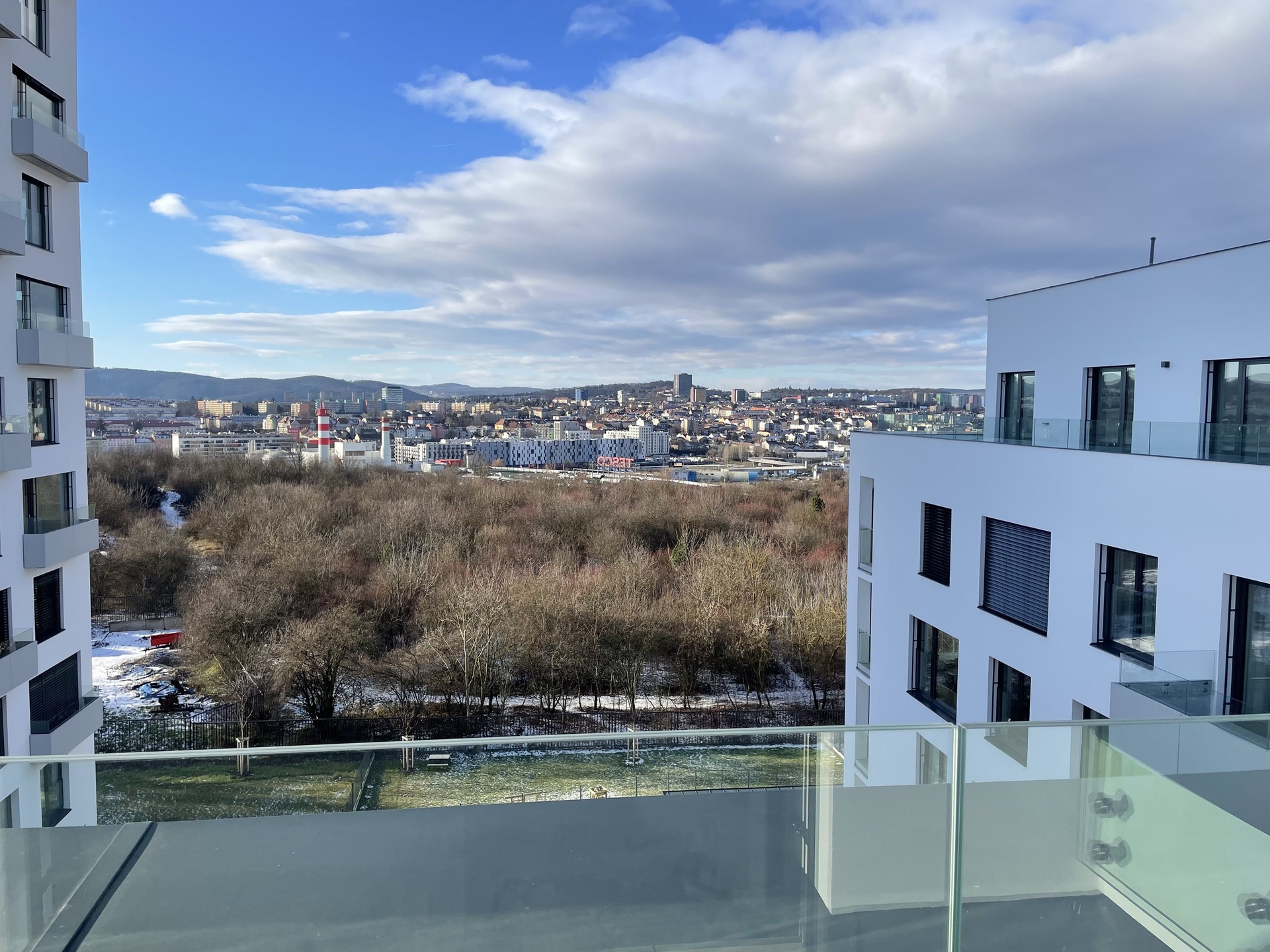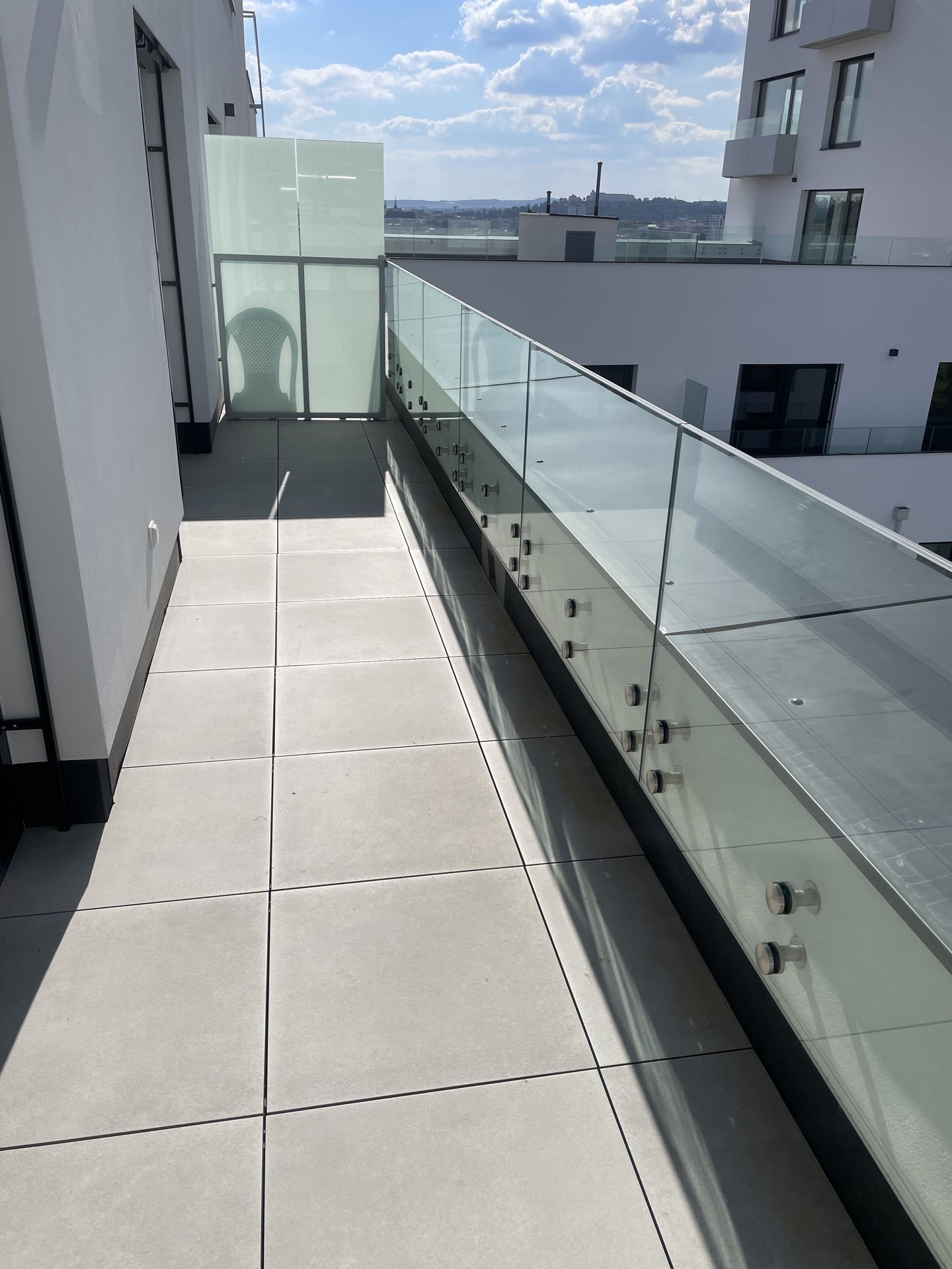 Byt je situován na západní stranu a je tedy velice světlý a příjemně prosluněný. K dispozici je klimatizace a předokenní žaluzie. Z obou pokojů lze vstoupit na prostornou terasu, která vybízí ke klidnému posezení a nabízí překrásný výhled do okolní zeleně a též na historické dominanty města.
