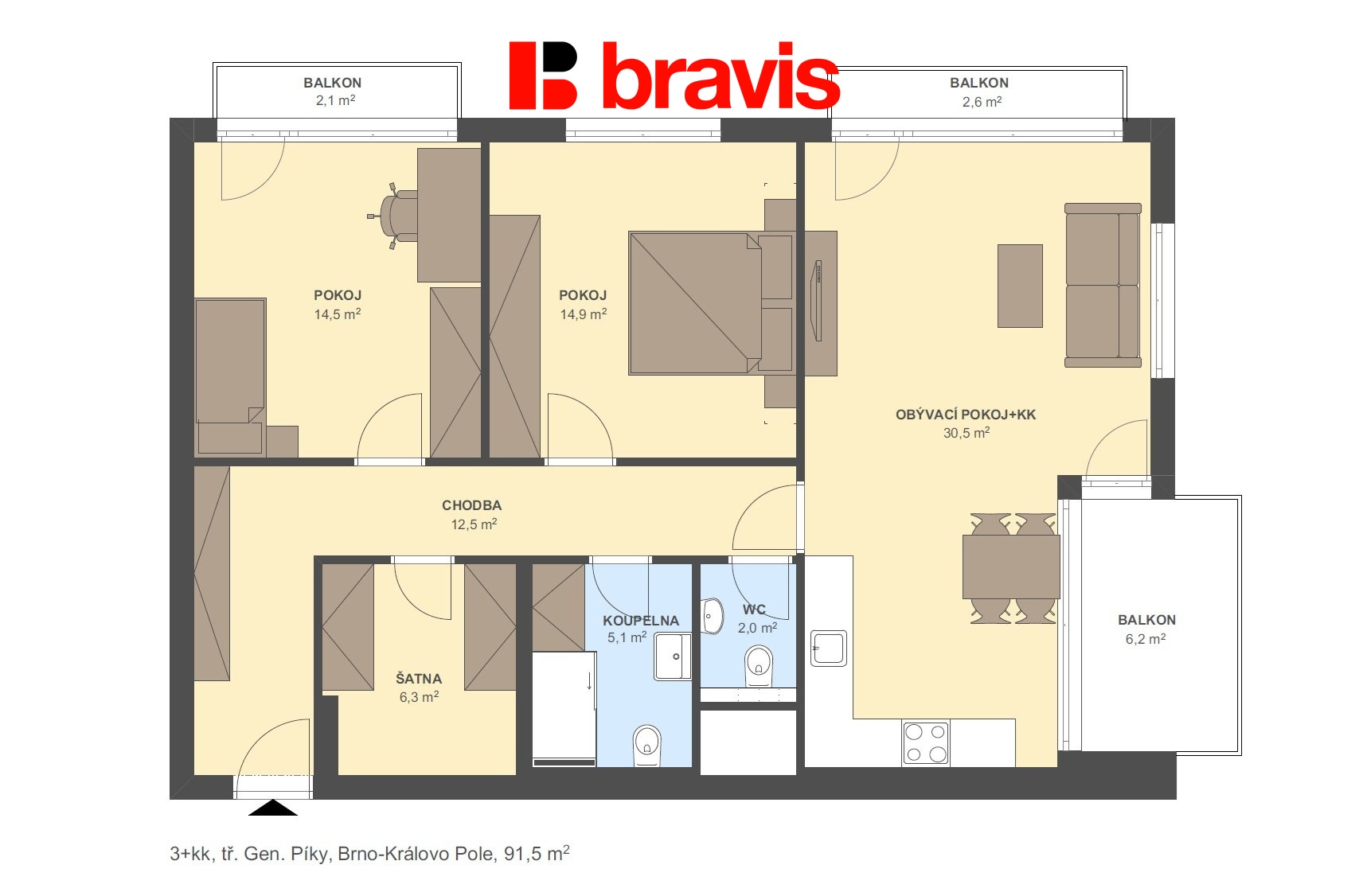 Výhradně nabízíme k pronájmu moderní a prostorný byt dispozice 3+kk o celkové ploše bytu 86 m² se dvěma balkóny (2,1 a 2,6m² ) a lodžií (6,2m² ) v novostavbě domu v žádané lokalitě Brno – Černá Pole, třída Generála Píky.