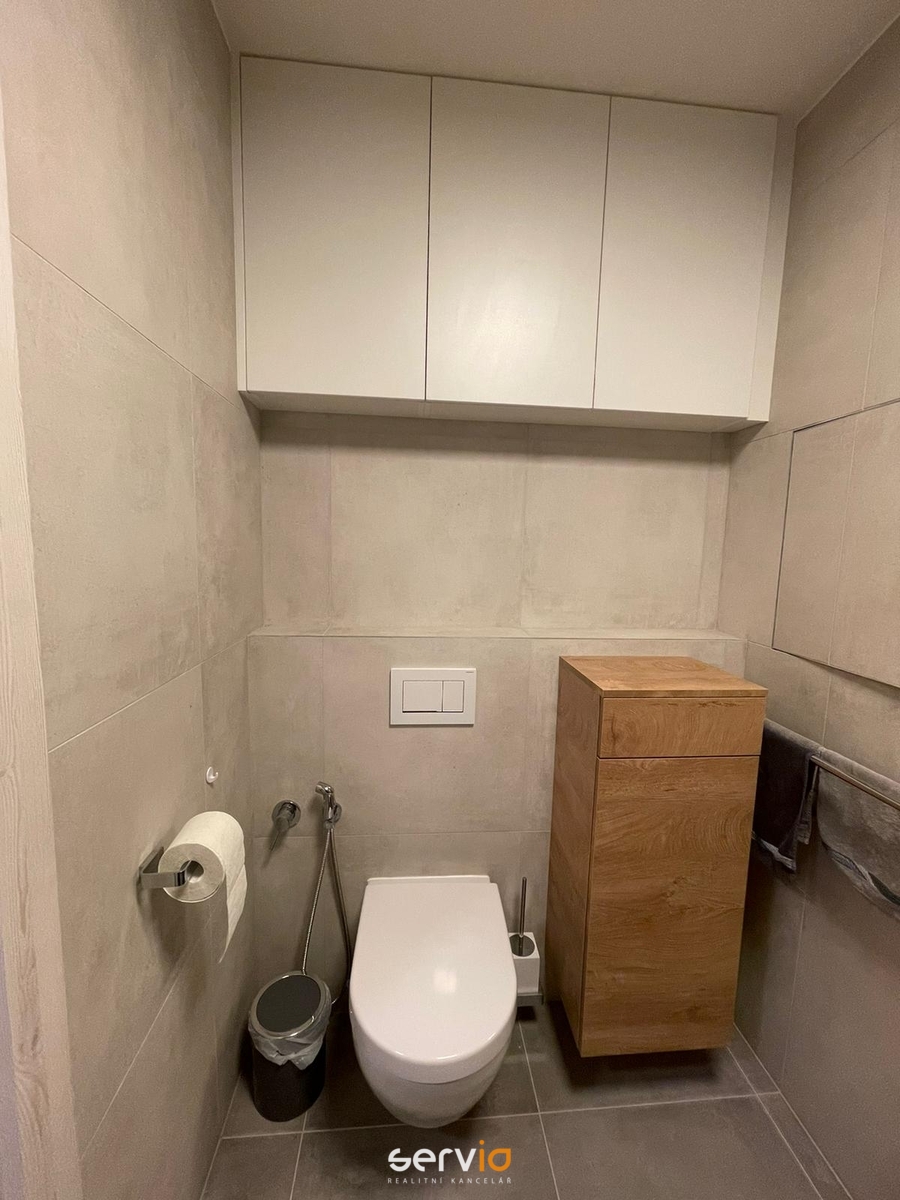 Byt má vstupní chodbu s vestavnými skříněmi, koupelnu s wc, ve které je sprchový kout walk-in a skříňka pod umyvadlem, jedna vedle wc a jedna nad Geberitem.