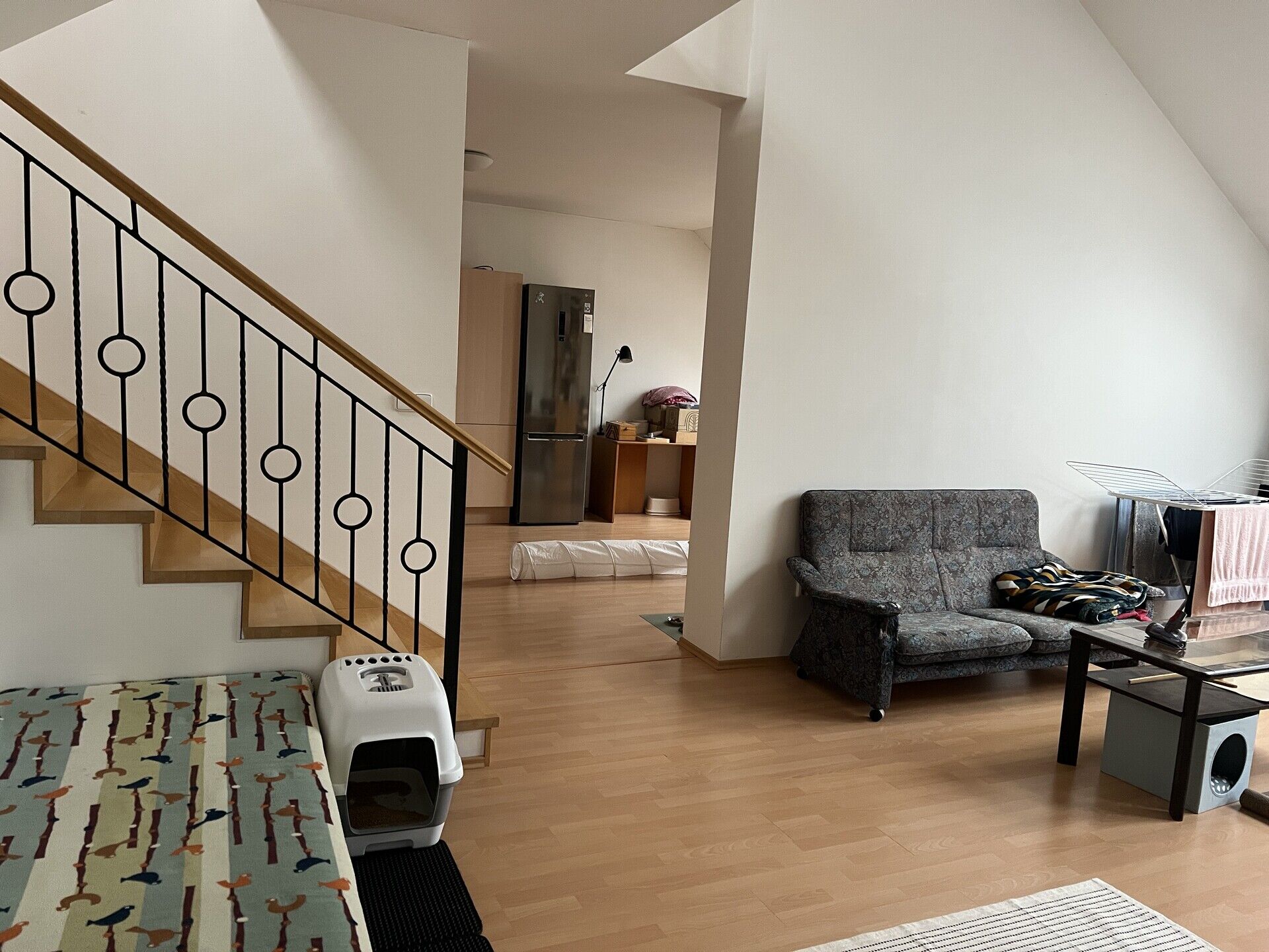Byt disponuje třemi neprůchozími pokoji, dvěma v horním patře a jedním v přízemí vedle společné obývací části a kuchyně. Celkem má byt 5 místností (jen obývací část a kuchyň není z jedné strany uzavíratelná dveřmi).