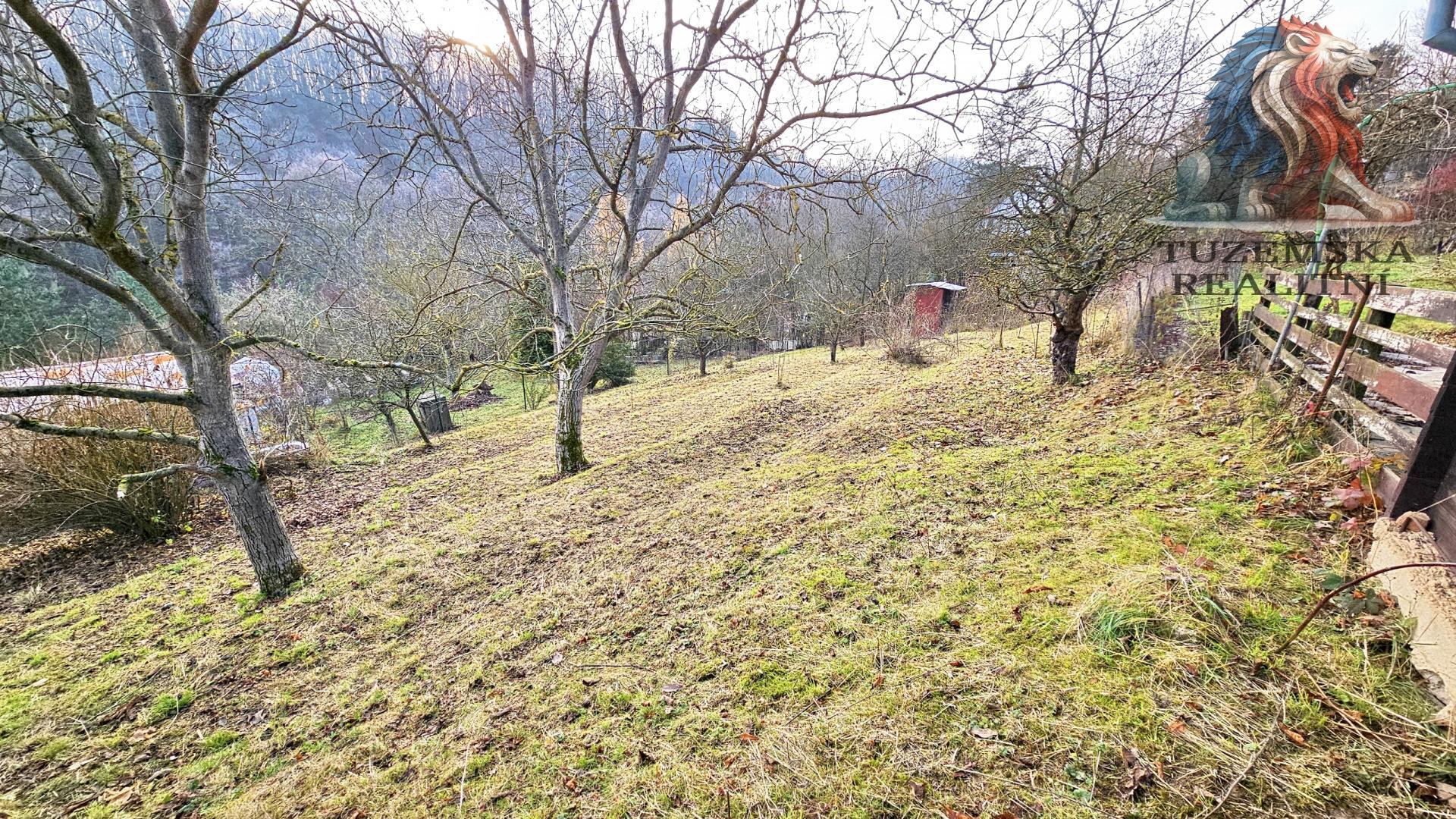 Na pozemku nyní stojí bouda na nářadí a rostou plodící stromy.