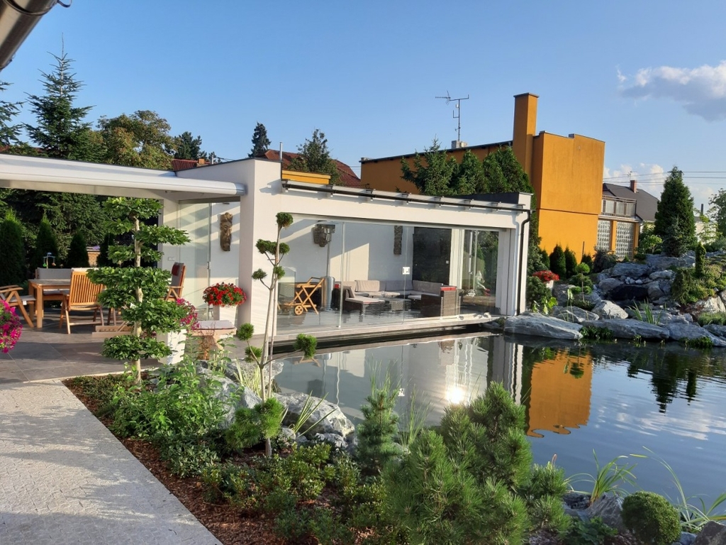 Výjimečným prvkem je koupací jezírko o ploše cca 100 m² včetně technologie – ideální pro letní osvěžení i relax v soukromí. Na pozemku se dále nachází prosklená zimní zahrada cca 25 m² a volně stojící hospodářská budova cca 25 m², využitelná jako sklad, dílna nebo technické zázemí.