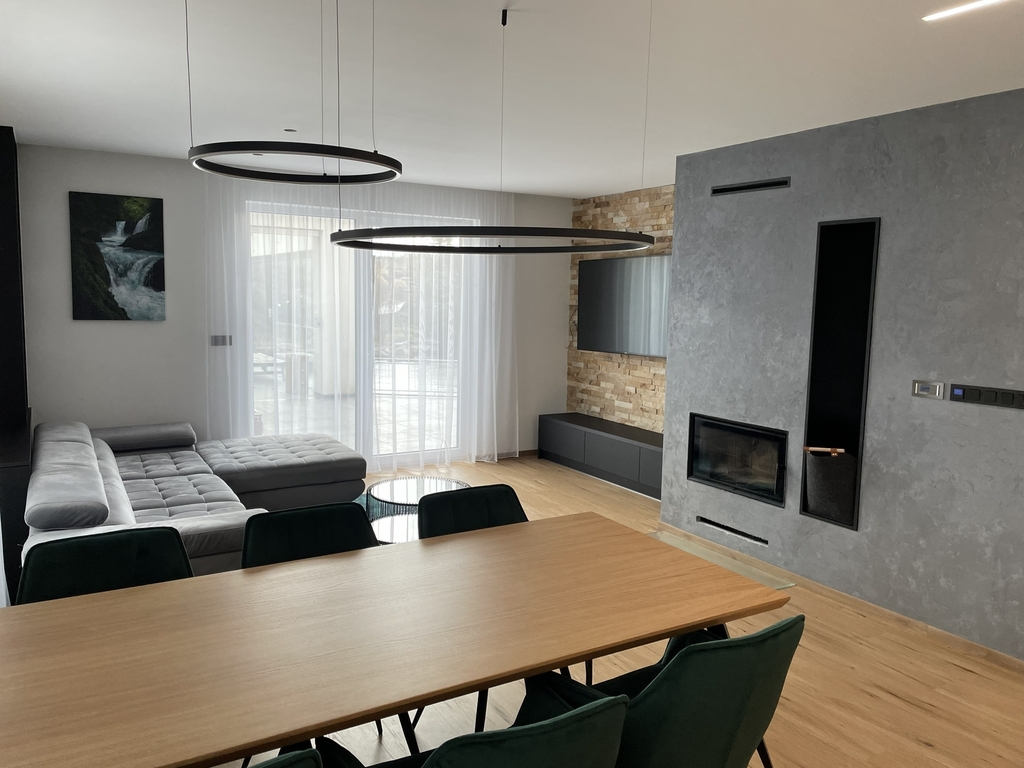Přízemí je řešeno jako otevřený denní prostor – obývací pokoj propojený s jídelnou a kuchyní. V obývacím prostoru je krb, který vytváří příjemnou atmosféru a zpříjemní chladnější období. Z obývací části je přímý vstup na terasu, kde je elektrická markýza pro pohodlné venkovní posezení. V přízemí se dále nachází samostatná toaleta, technická místnost a garáž.