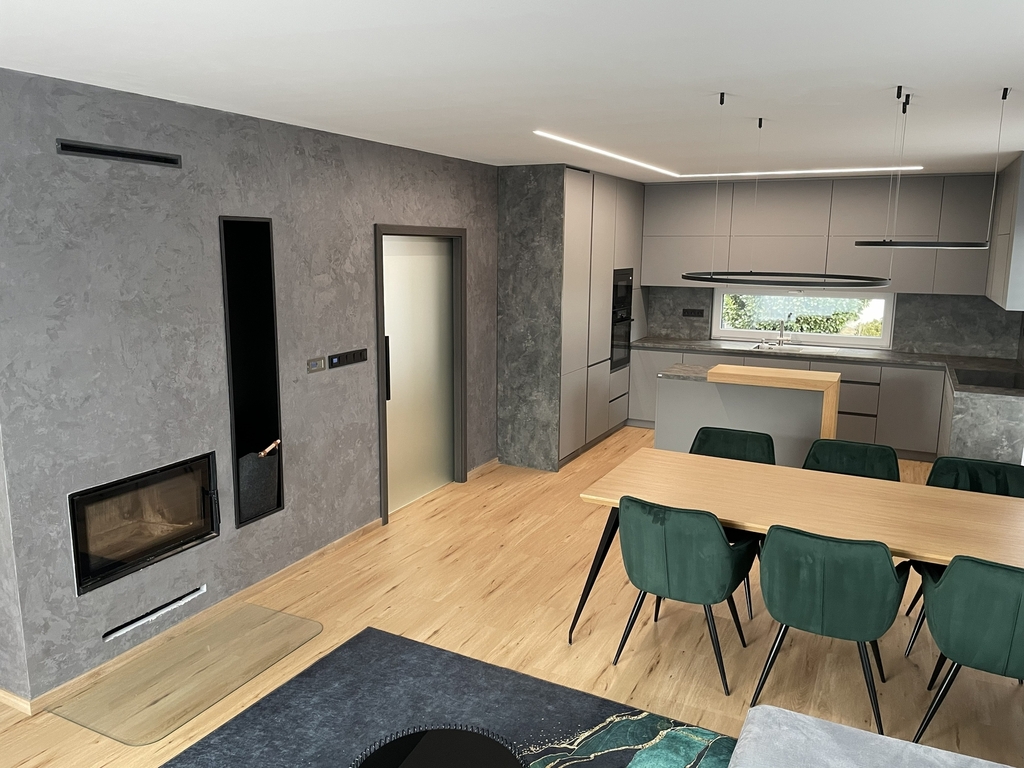 2. přízemí: obývák + jídelna + kuchyně, krb, vstup na terasu s elektrickou markízou, WC, technická místnost, garáž