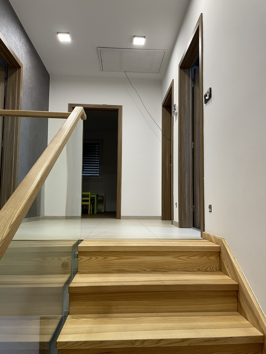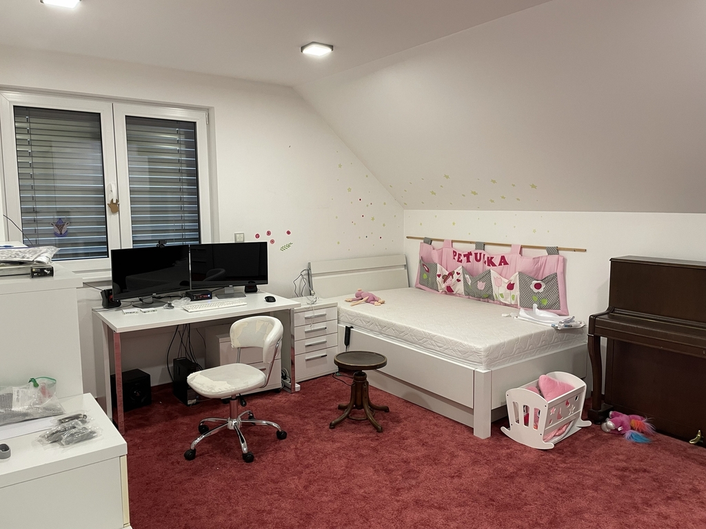 V patře jsou dva dětské pokojíčky, ložnice se samostatnou šatnou a prostorná koupelna vybavená rohovou vanou i sprchovým koutem. Samozřejmostí je také další toaleta. Dispozice je navržena tak, aby měla rodina dostatek soukromí a zároveň prakticky vyřešené každodenní fungování.
