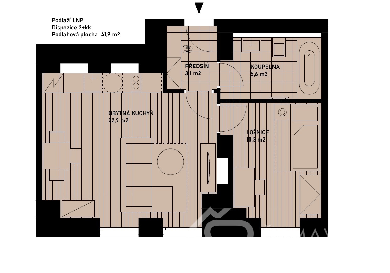Světlý vzdušný apartmán 2+kk o podlahové ploše 42 m2, kompletně plně vybavený.