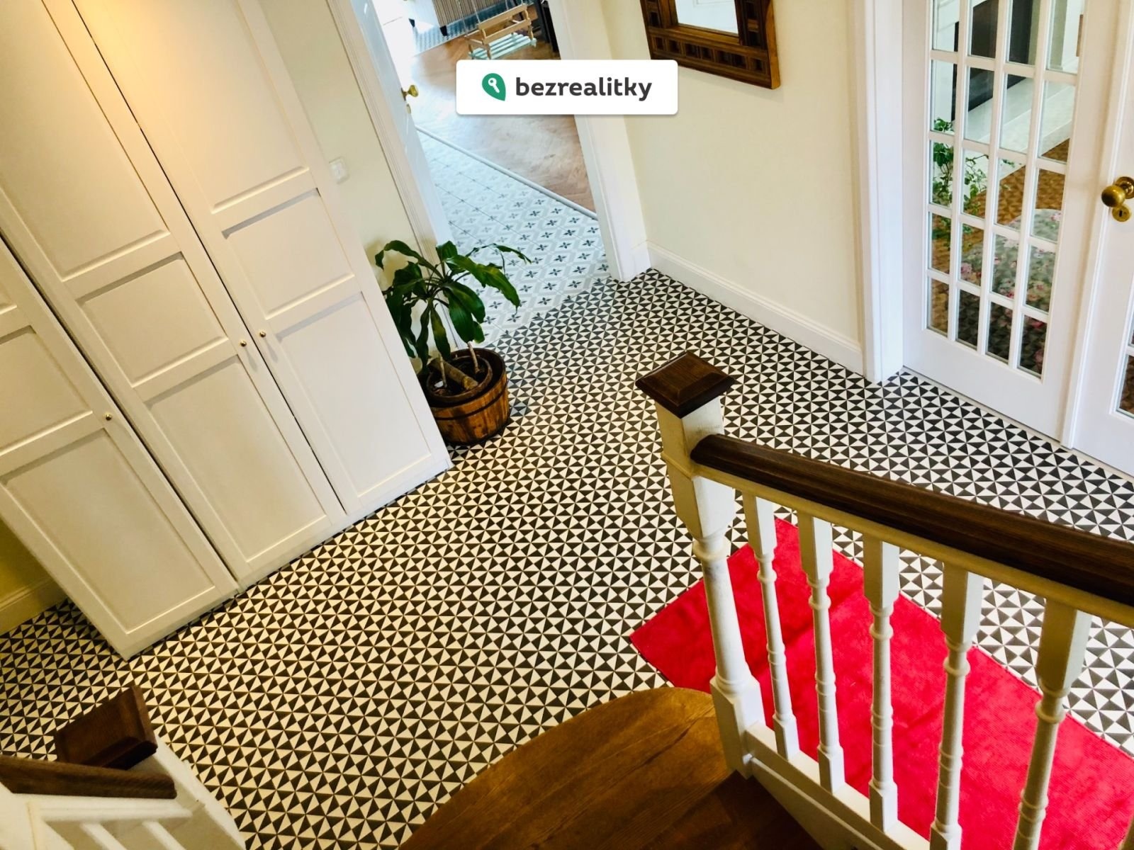 Interiér domu je zpracován s důrazem na detail: masivní dubové podlahy, španělské obklady Vives, zakázková kuchyně z masivu, dubové dveře s mosaznými klikami a ručně vyrobené schodiště.