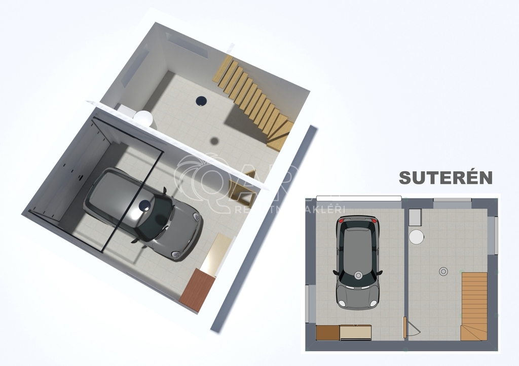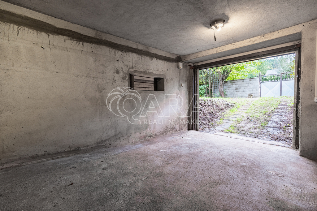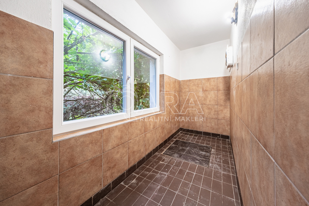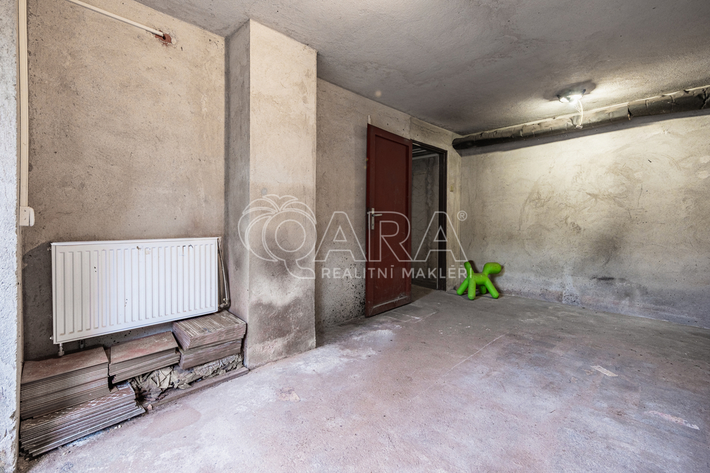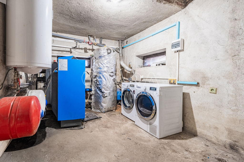 Suterén: garáž ovládaná elektrickými vraty a technické zázemí s kotlem Atmos, který umožňuje vytápění celé chaty.