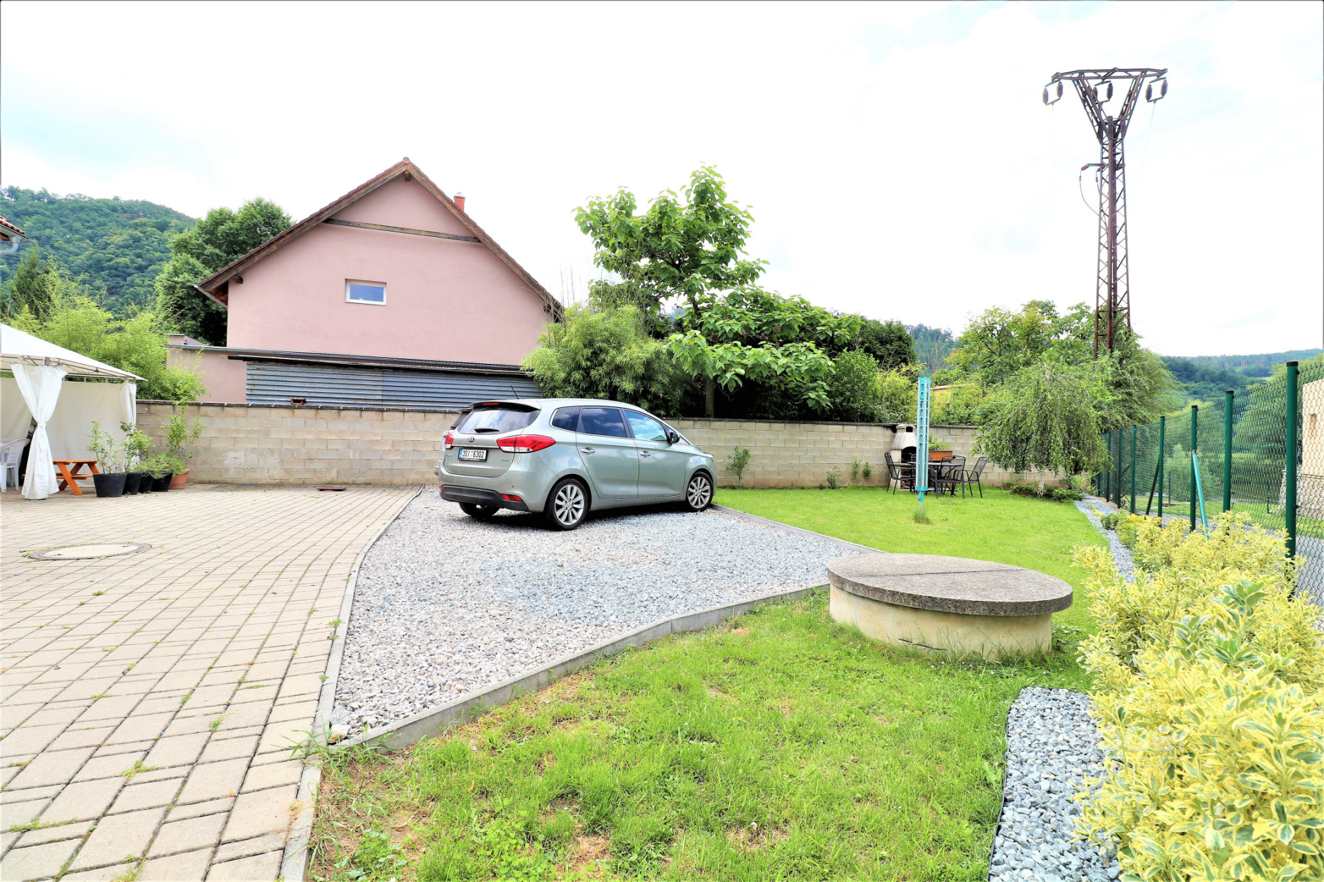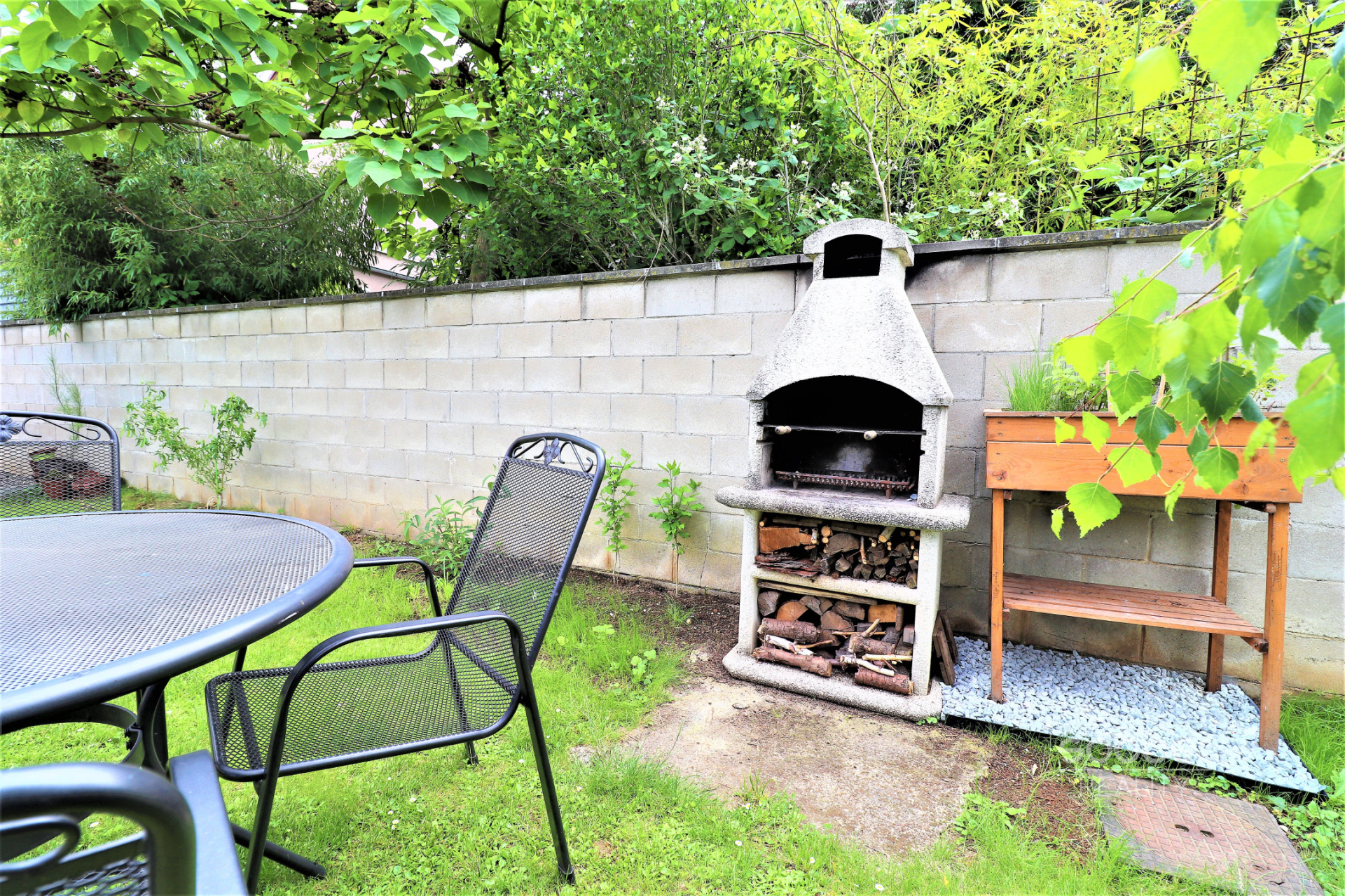 K bytu náleží i parkovací stání pro jeden vůz na oploceném pozemku, dále si můžete užít společnou zahradu s posezením, krbem a velkým sušákem na prádlo.