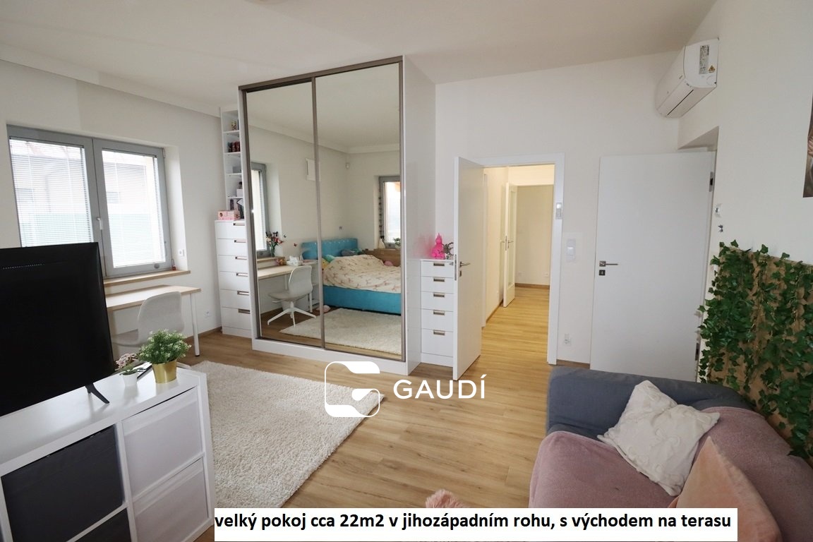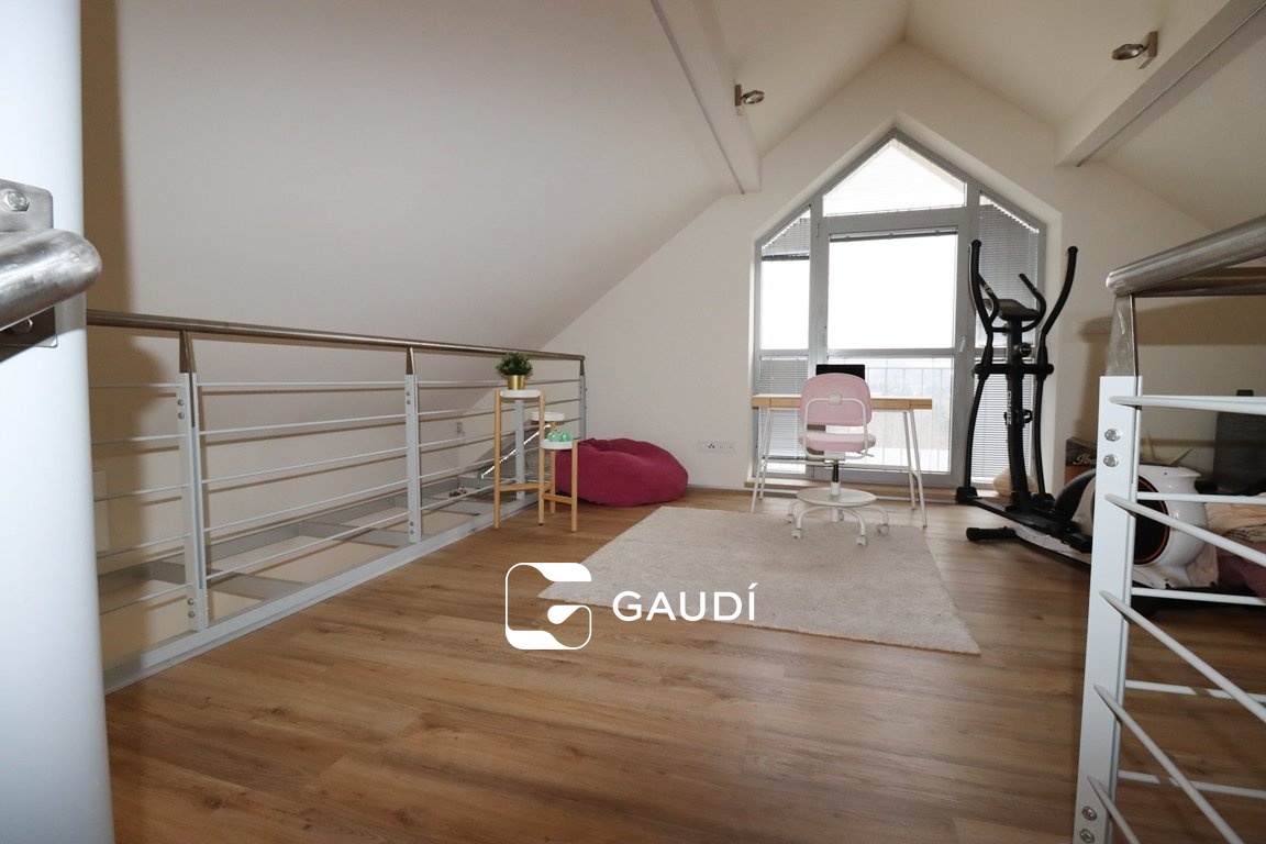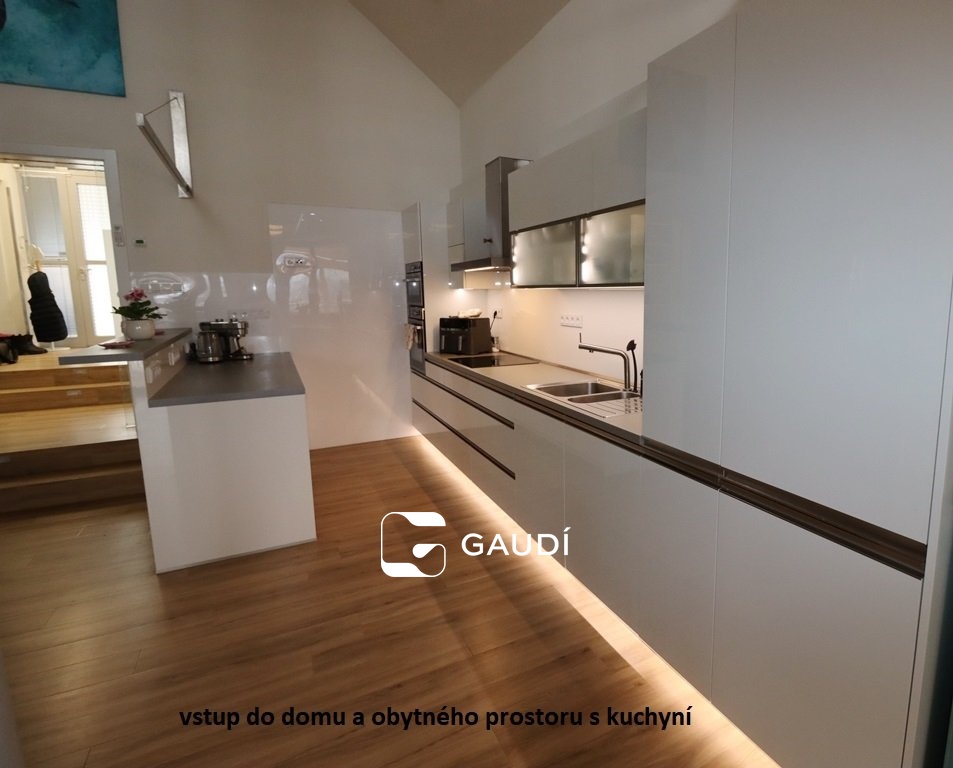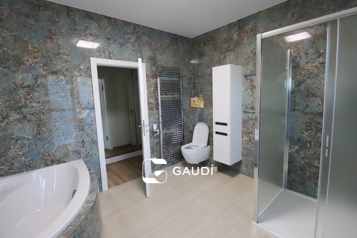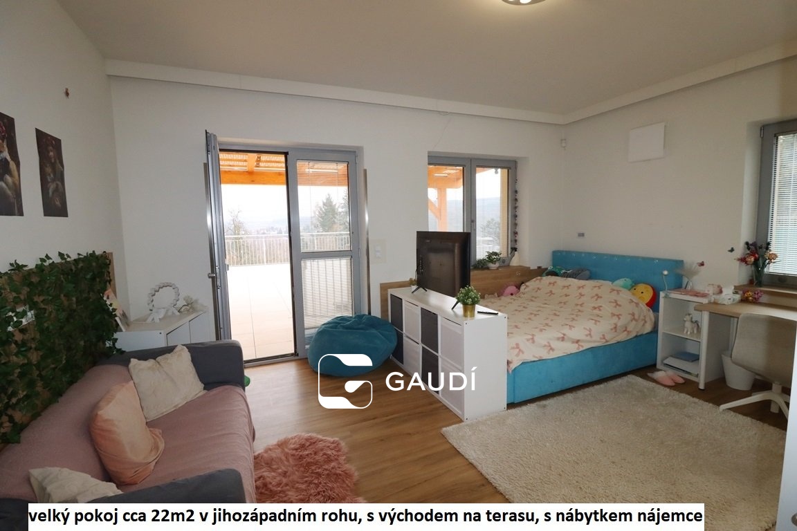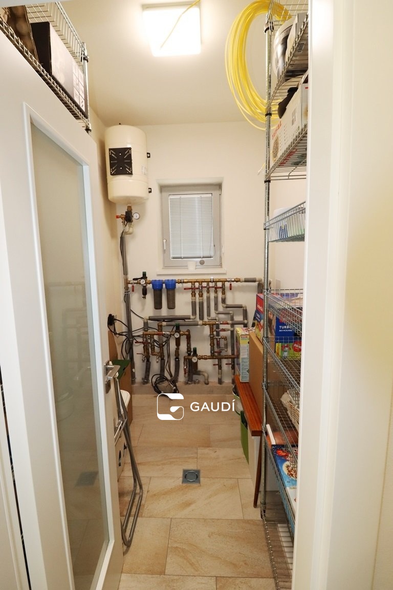 Jde o příležitost bydlení v rodinné luxusní komfortní rezidenci, která poskytuje bydlení v jedné podlahové ploše 5+kk +po točitém schodišti přístupné galerii, k tomu dvě koupelny- větší s vanou i sprchou, menší se sprchovým koutem, šatny, navíc samostatné WC, samostatná prádelna, komora, cca 100m2 velká terasa, částečně krytá pergolou - vybavena elektrickými ohřívači pro příjemnější posezení v chladnějších dnech nebo když třeba úplně nevyjde počasí na grilování Pro uložení např. sezónních dekorací apd.. lze využít neobytnou půdu přístupnou po vyklápěcích schodech.