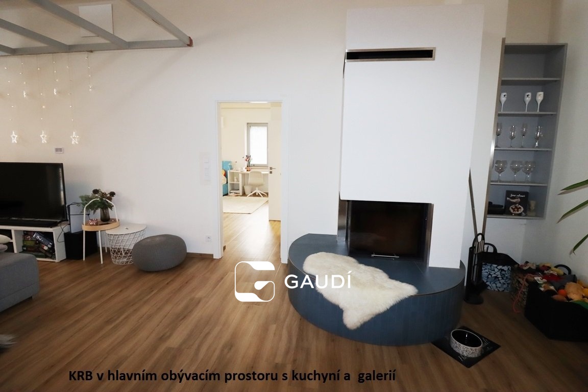Dispozice je velmi praktická, půdorys domu obdélníkový, v každém rohu najdeme jeden pokoj (4ložnice - velikost cca 16,5m2, 2x cca 19m2, 22m2), středu dominuje velký obývací prostor cca 60m2 s moderní bílou kuchyňskou linkou se světly, krbem a po točitém schodišti přístupnou galerií cca 20m2 (jako 6.pokoj) – východ na velkorysou terasu cca 100m2.