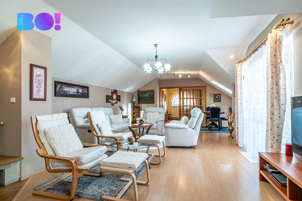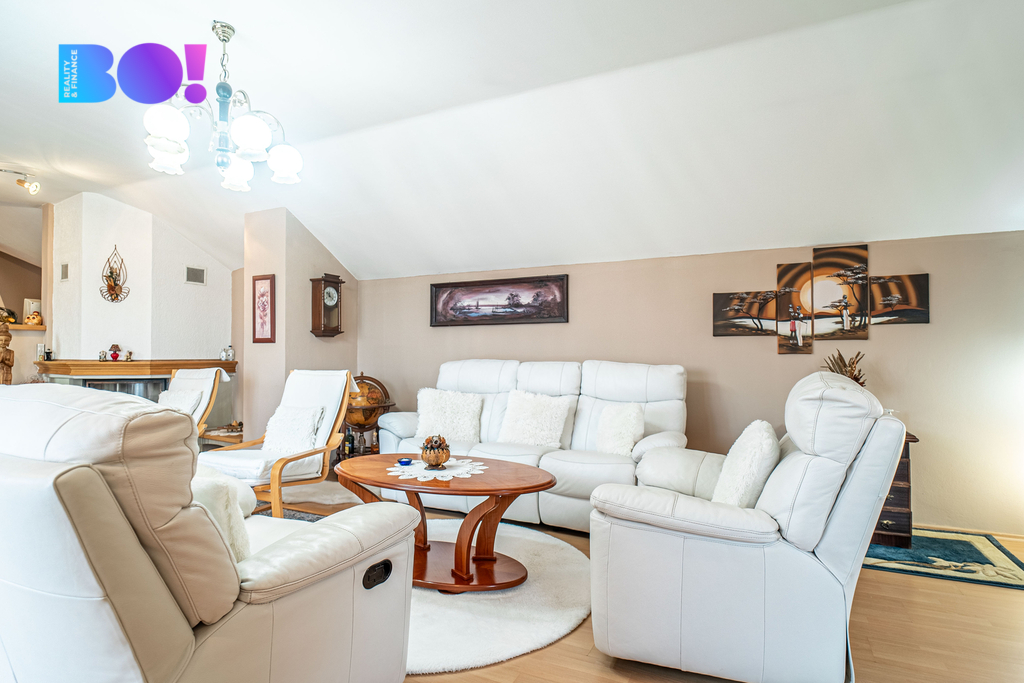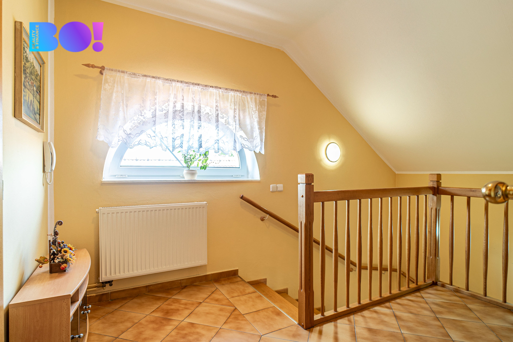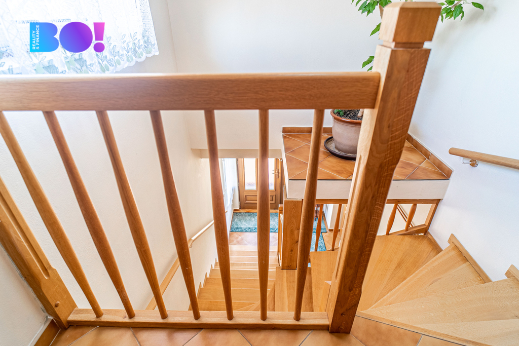 Z obývacího pokoje v patře je přímý vstup na velký balkon s krásným výhledem do okolní přírody, který nabízí ideální prostor pro ranní kávu, odpočinek nebo večerní posezení.