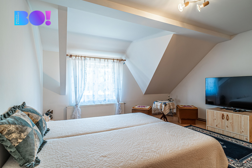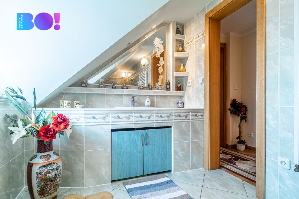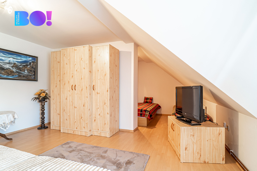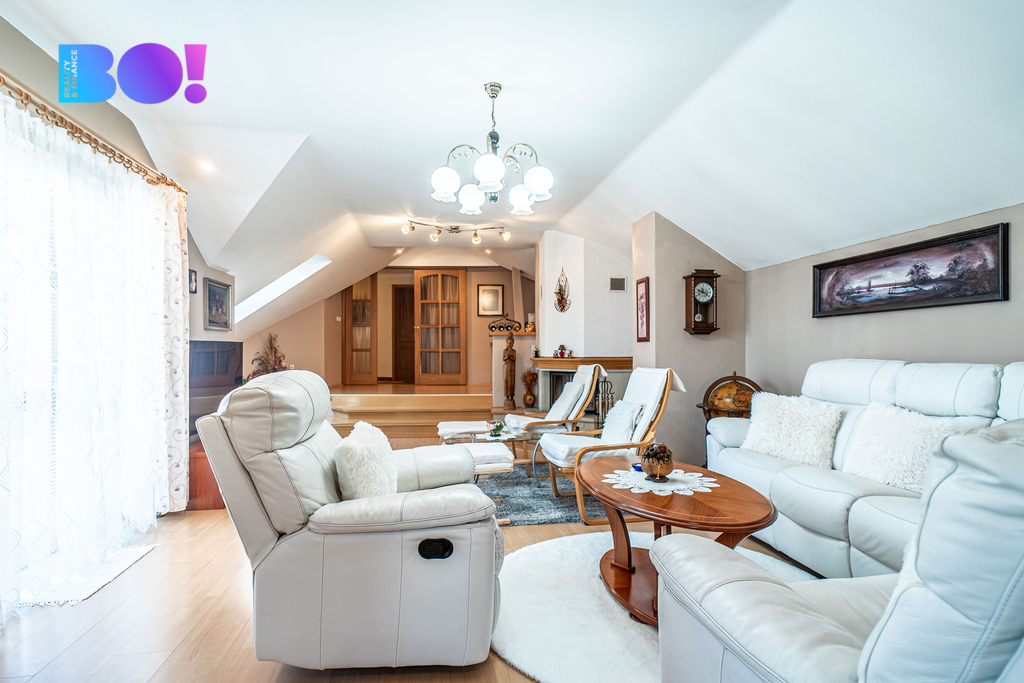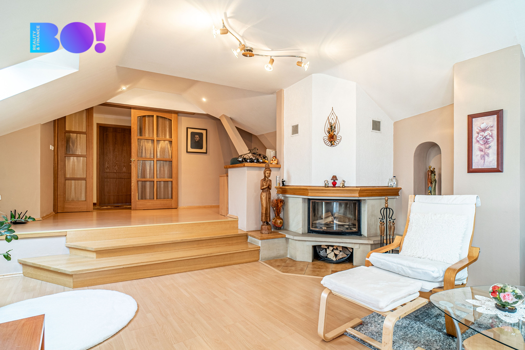 Z obývacího pokoje v patře je přímý vstup na velký balkon s krásným výhledem do okolní přírody, který nabízí ideální prostor pro ranní kávu, odpočinek nebo večerní posezení.
