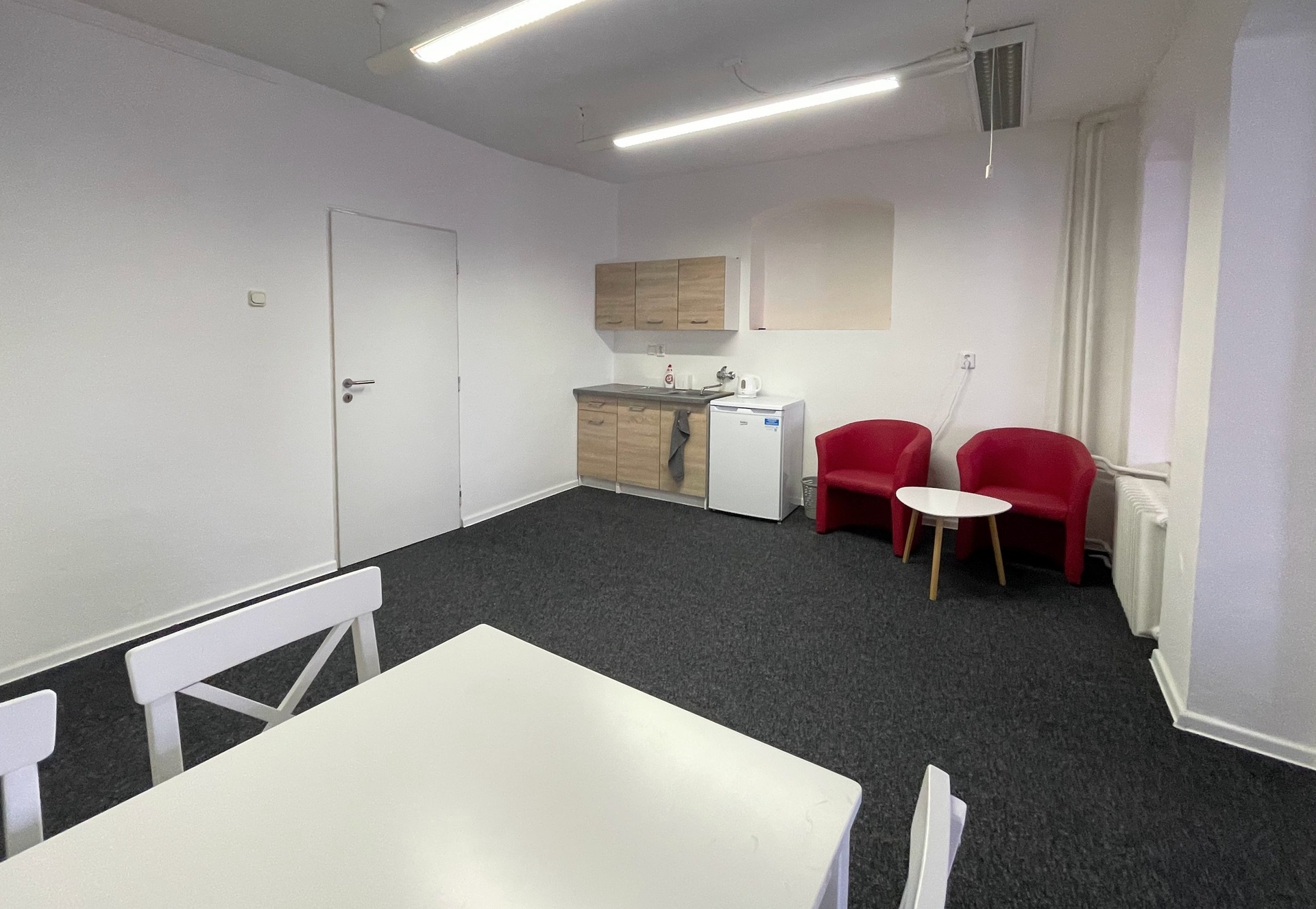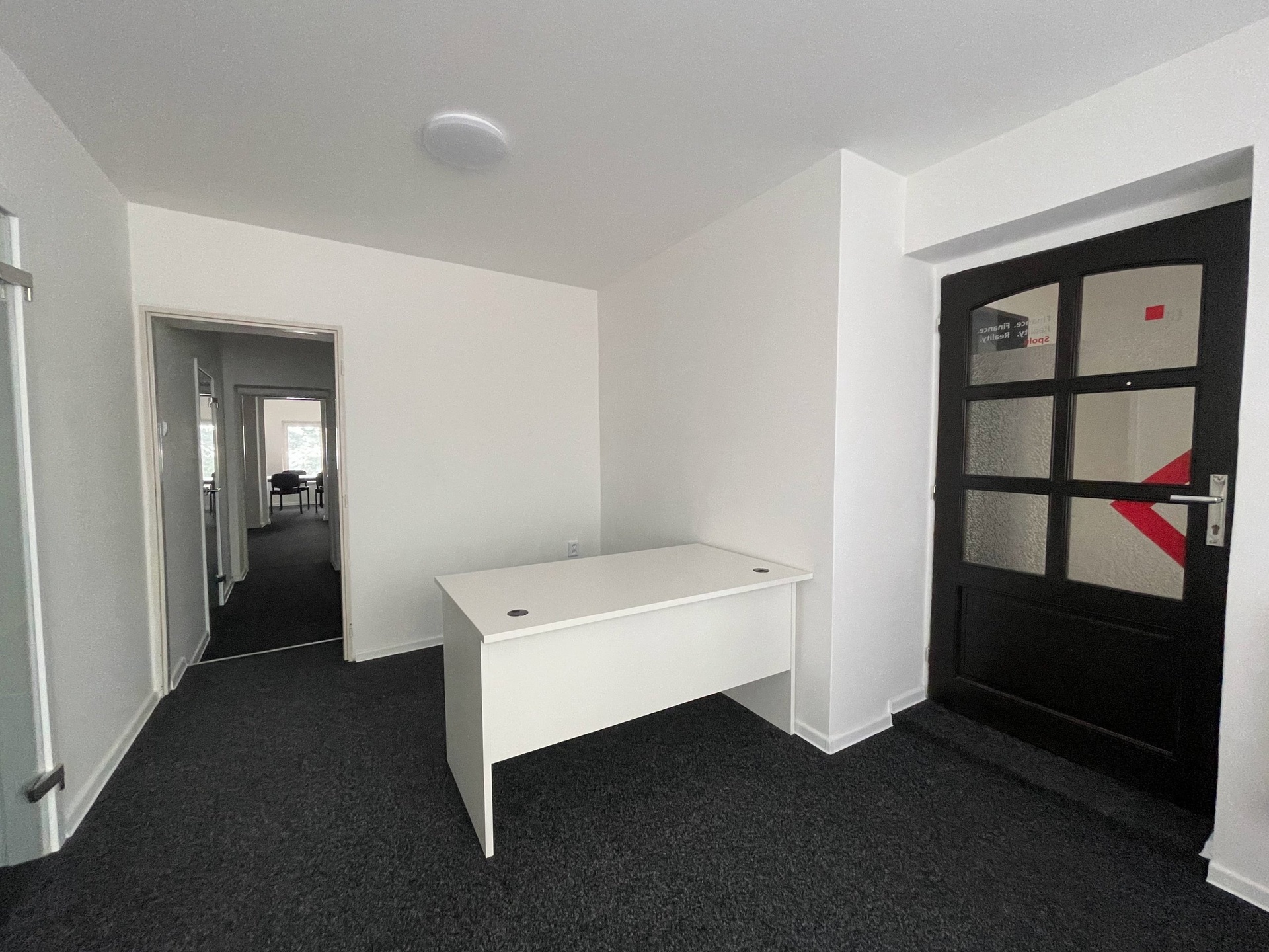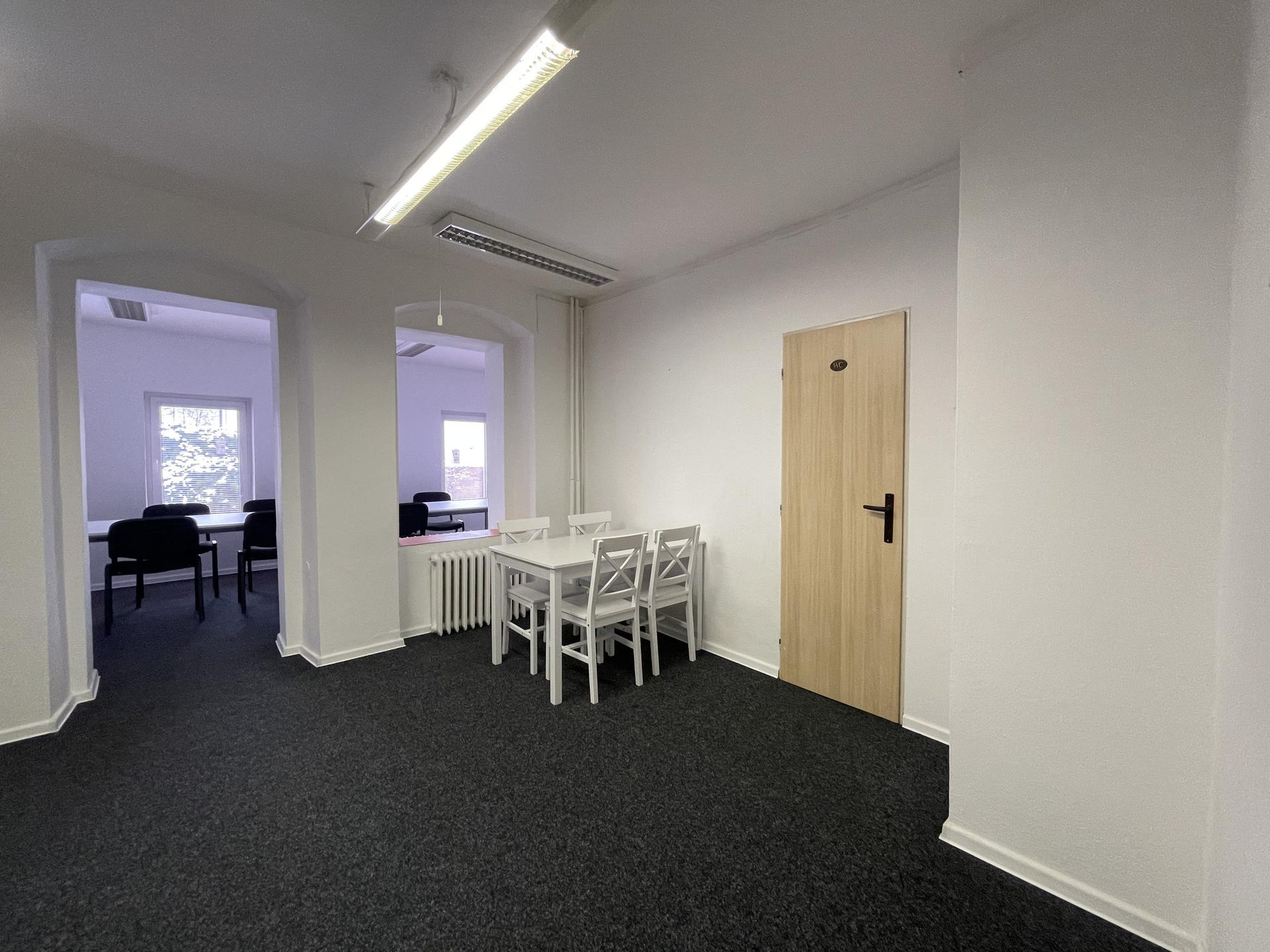 K dispozici jsou i kanceláře v 1. patře o výměře 35m2. Jedná se o dvě průchozí místnosti disponující kuchyňským koutem. WC na patře je společné. Měsíční nájem u těchto prostor činí 4.000 Kč.