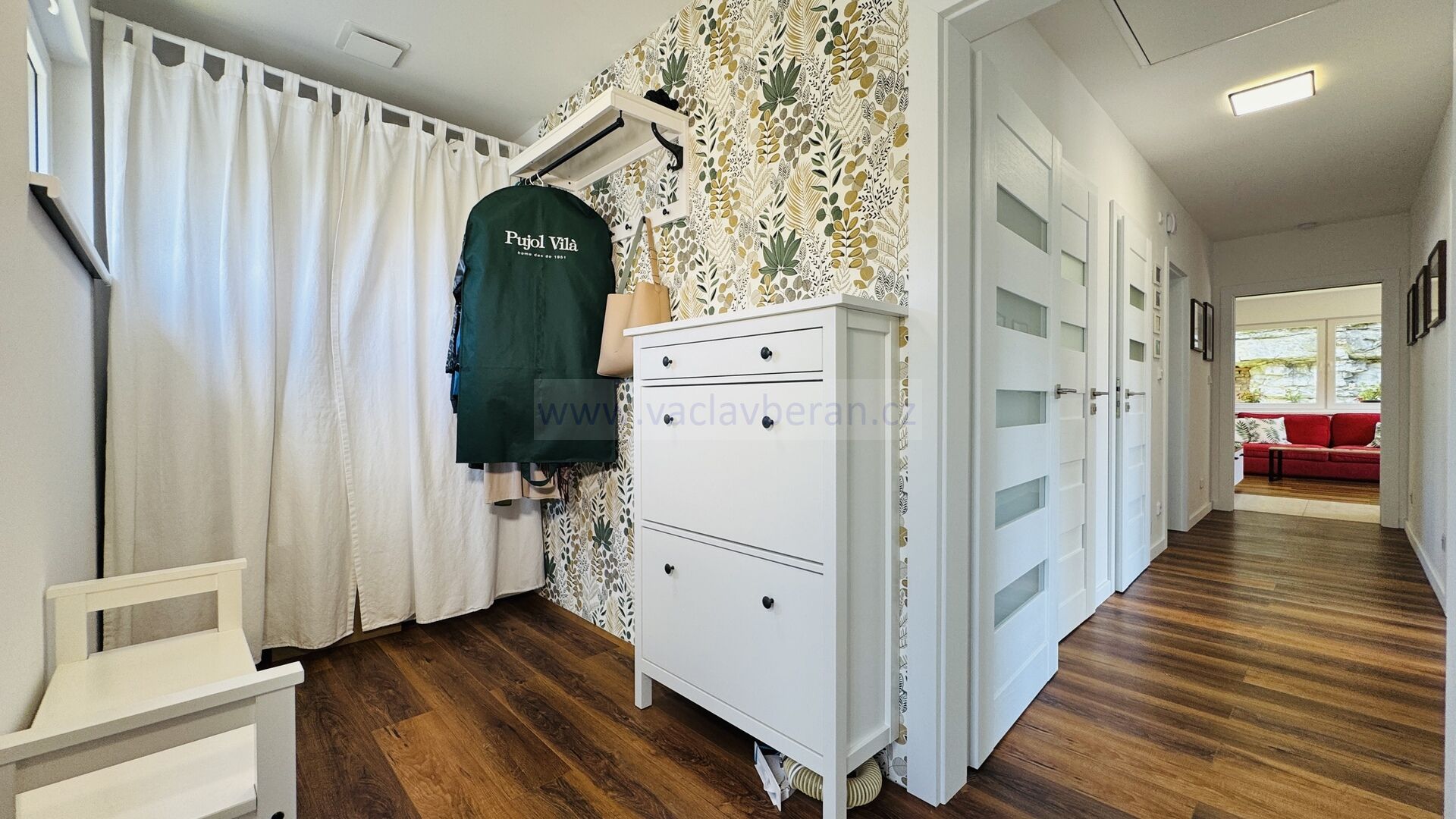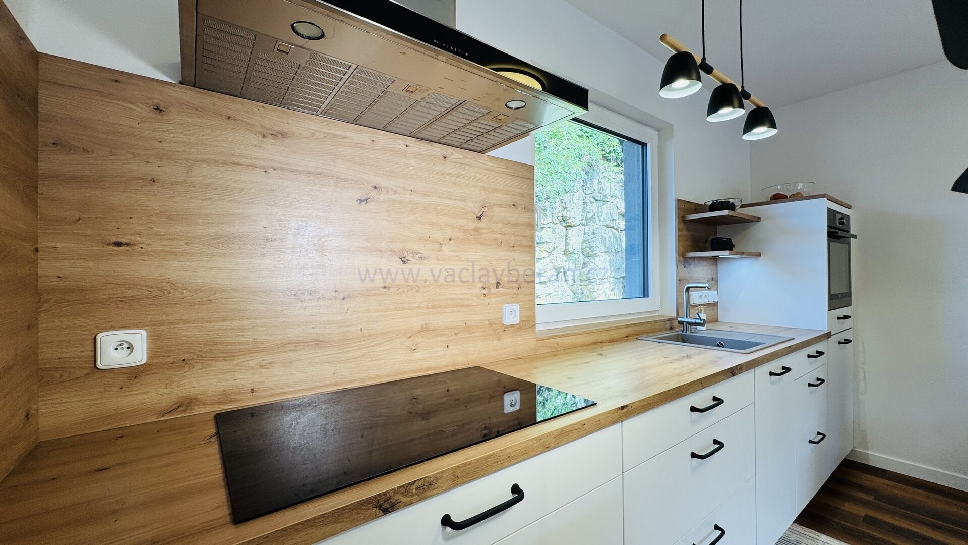Možnost ponechání stolů (dekor dub Artisan), nábytku na chodbě a v technické místnosti, regálů Ikea ve spíži (vše po dohodě)