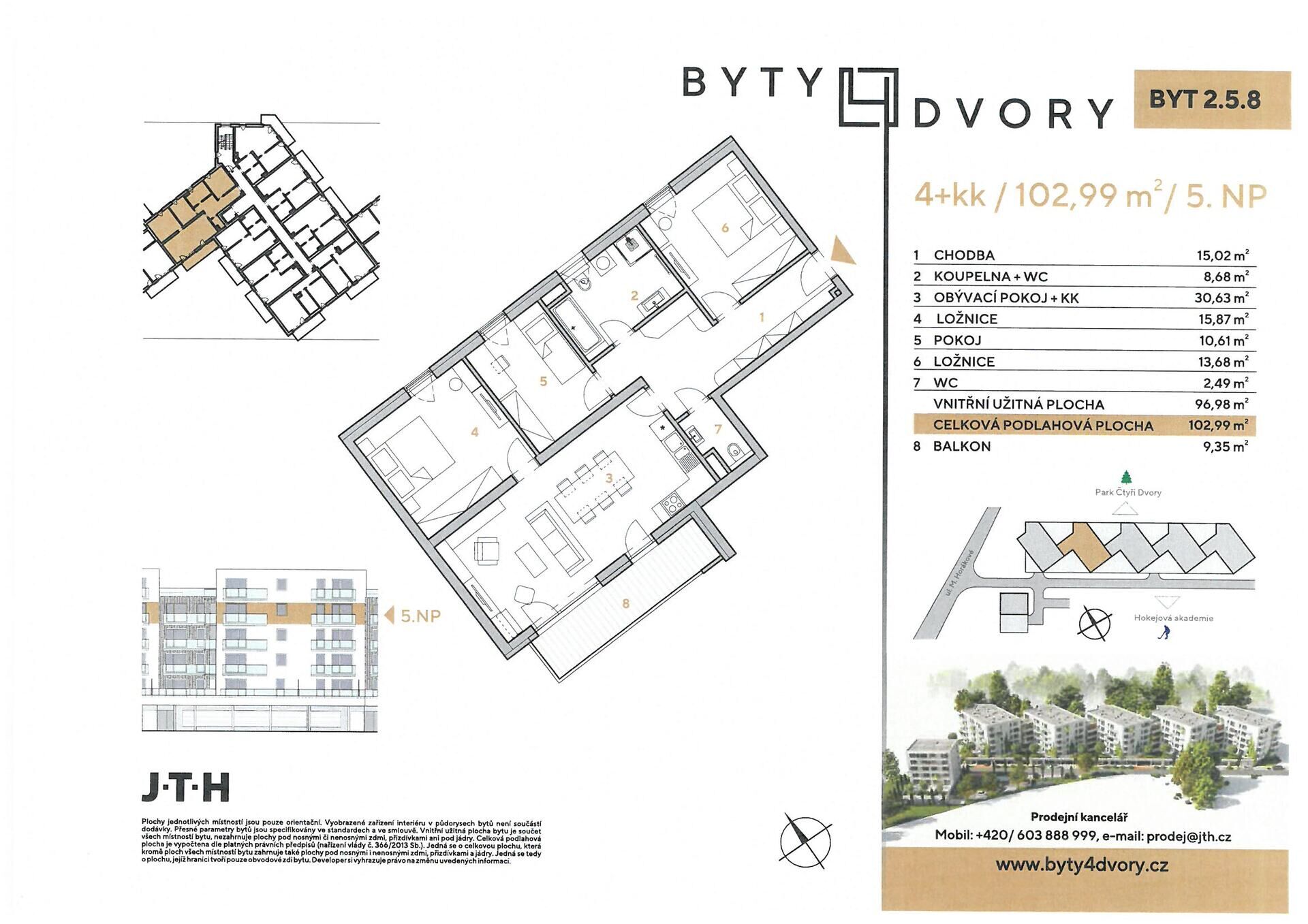 Nabízený byt v této inzerci je dispozice 4 + kk o výměře 102,99 m2 a jeho příslušenstvím je balkon 9,35 m2. Byt č. 2.5.8 se nachází v 5. NP šestipodlažního bytového domu s výtahem BYTY 4 DVORY, sekce 2. Předpokládaný termín dokončení stavby je prosinec 2025. Dispoziční řešení bytu: ze vstupní chodby (15,02 m2), která svou velikostí umožňuje umístnění vestavěných skříní je přístupná velká koupelna (8,68 m2), která je vybavena vanou, sprchovým koutem, umyvadlem, toaletou a přípojkou pro pračku. Naproti koupelně se nachází samostatná WC místnost s toaletou a umyvadlem. Chodba je komunikačním prostorem celého bytu a zajišťuje přístup do ložnice 1 (13,68 m2) a pokoje (10,61 m2). Z chodby je dále vstup do obytného prostoru (30,63 m2) s kuchyňským koutem. Ložnice 2 (15,87 m2) je přístupná z obytného prostoru. Obytný prostor je prosvětlen velkou okenní sestavou a je z něho přímý vstup na balkon (9,35 m2). Obytný prostor je orientovaný na jih a ložnice i pokoj jsou orientovány na severozápad. Standardní vybavení bytu: kvalitní zařizovací předměty koupelny (sprchový kout, umyvadlo, toaleta, přípojka pro pračku), obklady, dlažby, vnitřní dveře a podlahové krytiny.