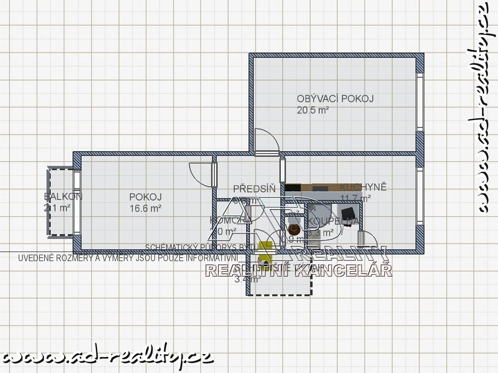 Celková plocha bytu 64m2, podlahová plocha bytu 60,5m2 + balkon + sklep.
