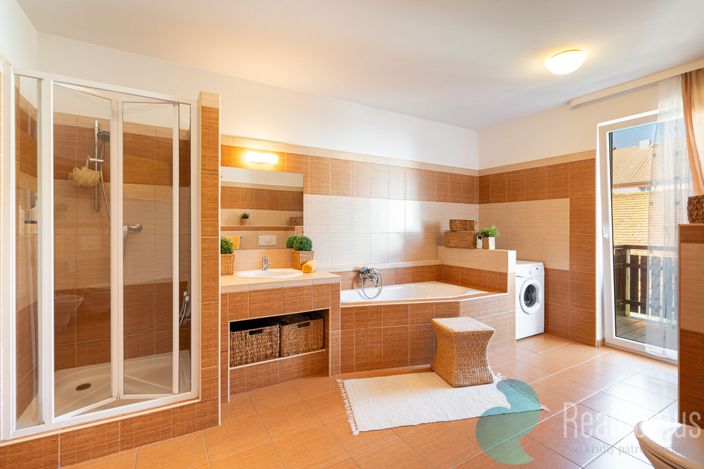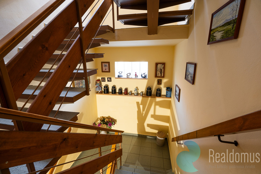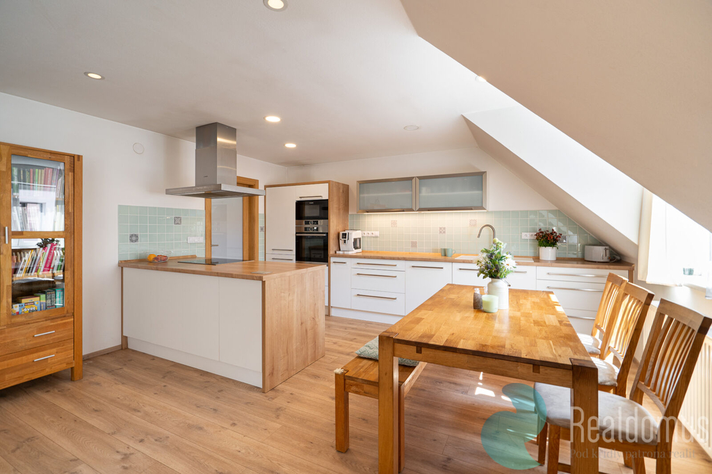 Ve 2. NP je pak velký, stylový a prosvětlený podkrovní byt 3kk (104 m2) s nádhernou novou kuchyní a místností se saunou, Byt má velkorysou hlavní obytnou místnost (41 m2) s kuchyňským koutem, jídelnou a obývacím pokojem s krbovými kamny. Dále zde najdeme ložnici, dětský pokoj, koupelnu s vanou, sprchovým koutem a toaletou, Další toaleta se nachází v místnosti u vchodu do bytu, kde je i velké vestavěné umyvadlo a sauna.