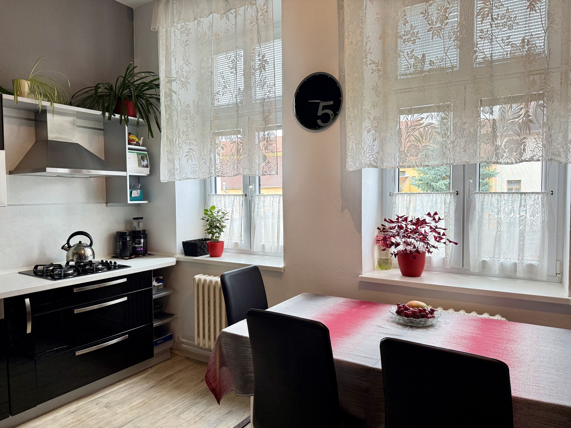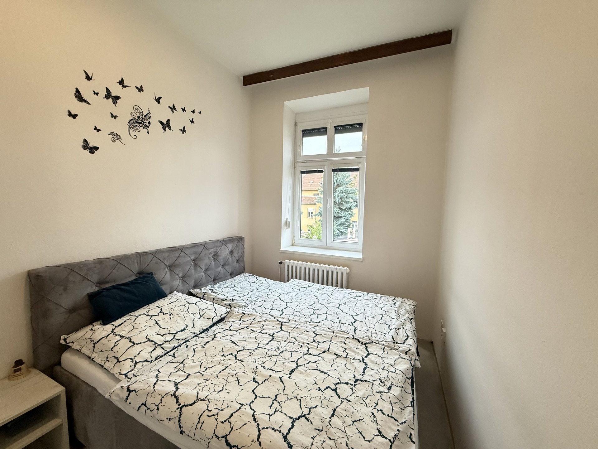 Dostatek vnitřního prostoru dotváří místnosti s vysokými stropy se světlou výškou 3,1 metru. Vnější zdivo o tloušťce 60 cm (cihla + zateplení) přispívá k výbornému tepelnému komfortu jak v zimních, tak i letních měsících. Vytápění vlastním plynovým kotlem umožňuje nezávislost a individuální regulaci energie dle vlastní potřeby. Byt má zrekonstruované vnitřní instalace (voda, odpad, plyn), zděné jádro s vanou, kvalitními prvky sanity, instalovanou pračkou, oddělené WC s umyvadlem, velká kuchyňská linka s vestavěnými spotřebiči (plyn. sporák, el. trouba, mikrovln. trouba, myčka) a úložnými prostory. V celém bytě podlahy - protiskluzový thermofix a v obýváku a pokoji navíc – OSB desky + hobra. Všude vnitřní žaluzie, v ložnici navíc vnější předokenní žaluzie. Komoru s vysokým stropem je možné využít jako prostornou šatnu nebo sklad. Internet. připojení (Starnet). Byt může zůstat kompletně zařízený s možností nastěhování bez dalších výdajů za vybavení (sedačka, stěna, šatní skříně, postele, pračka, menší fitness apod.). Byt je dlouhodobě udržovaný jedním stabilním vlastníkem (28 let), který vzhledem ke své aktuální situaci hledá RD mimo ČB = možnost jednání o případné výměně.