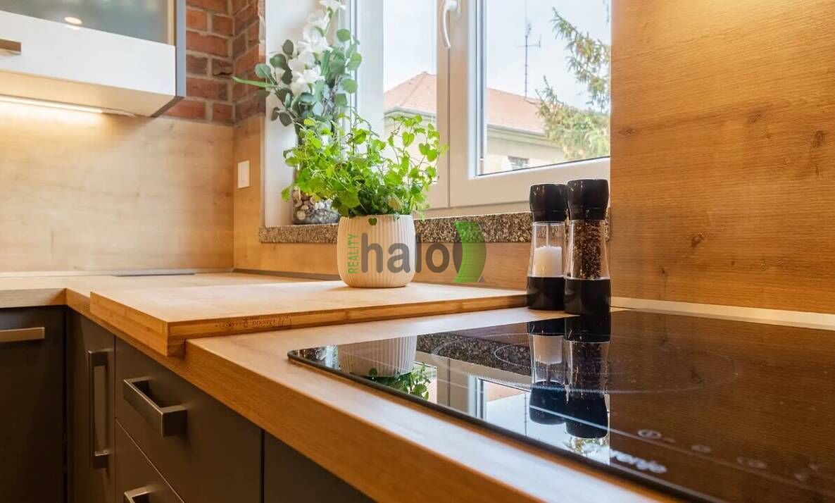 Kuchyňská část je řešena velmi prakticky – prostor je uspořádán do tvaru písmene L, díky čemuž zde našlo místo jak moderní kuchyňské zázemí vybavené všemi spotřebiči (myčka, trouba, sklokeramická deska, lednice), tak i útulný jídelní kout pro společné stolování.