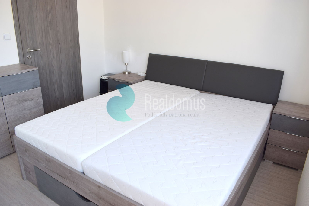 Dispozice bytové jednotky : zádveří, obývací pokoj s kuchyňským koutem se vstupem na terasu ( 8 m2) opatřenou markýzou na dálkové ovládání , dále ložnice a koupelna s toaletou. Byt je pronajímán včetně vybavení, dle přiložených fotografií. Kuchyňská linka vybavena : lednice s mrazákem, indukční varná deska s el. troubou, digestoř.