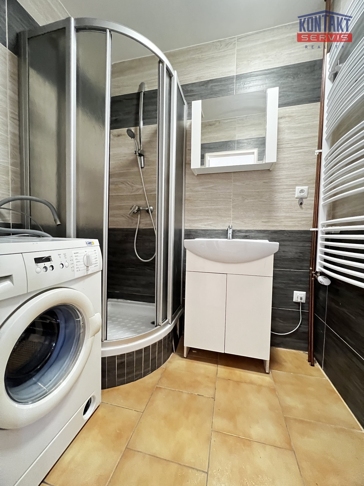 V koupelně nalezneme sprchový box a skříňku s umyvadlem a baterií a horní skříňku se zrcadlem. Samostatné WC.