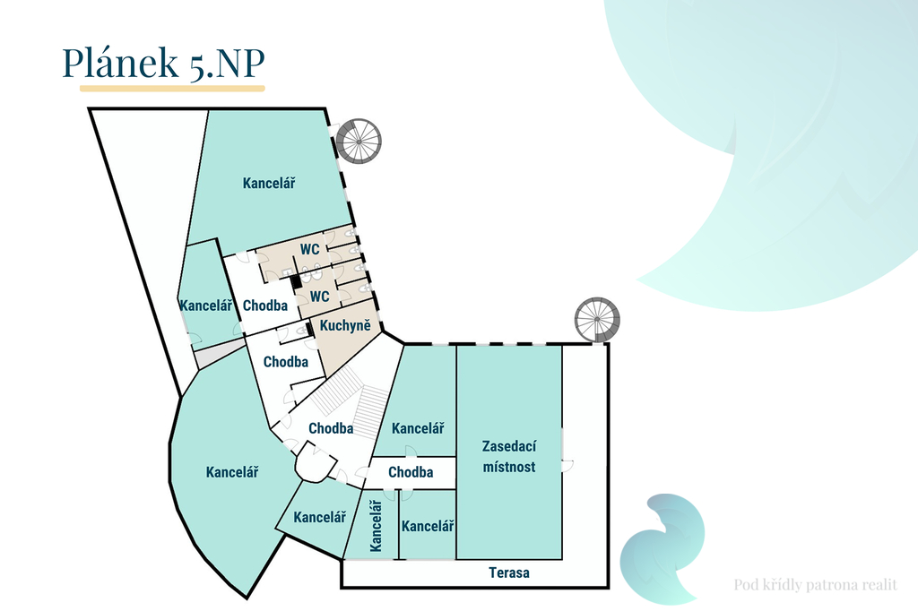 Aktuálně nabízíme pronájem 4.NP o velikosti cca 466 m2 a 5. NP o velikosti 378 m2. V každém patře je k dispozici společná kuchyňka a toalety. Kanceláře lze pronajmout také samostatně.