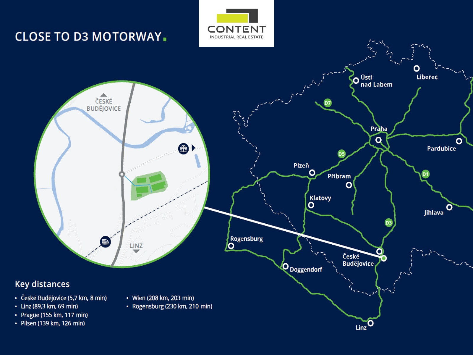 V zastoupení majitele a bez provize nabízíme novostavbu skladu nebo výrobních prostor, umístěnou v moderním parku nacházejícím se podél silnice E55 s přímým napojením na mezinárodní dopravní síť (České Budějovice - Linz). Nové spojení ''Jižní tangenta'' s Českými Budějovicemi a dálnice D3 je v současné době ve výstavbě.