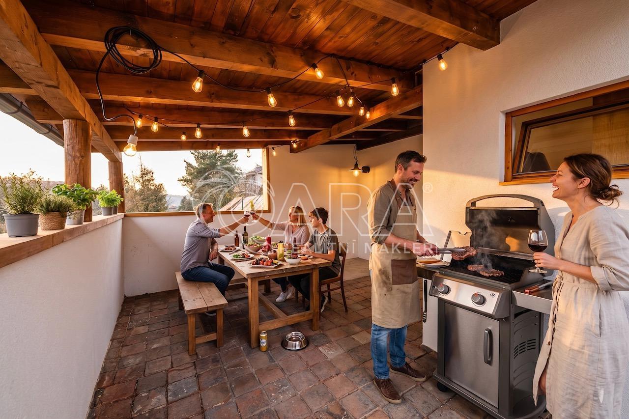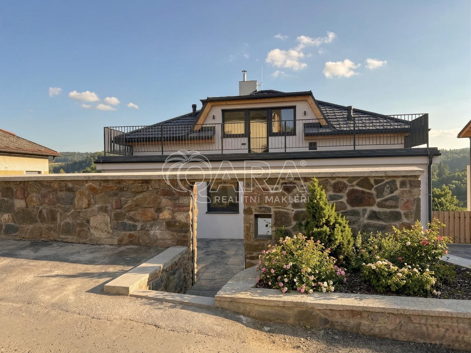 Pro páry milující styl: Užijte si velkorysý obývací pokoj s přilehlou terasou, kde se sklenka vína s přáteli mění v nezapomenutelný zážitek. Moderní design, výhled na lesy a horizont a zahrada bez nutnosti složité údržby jsou definicí svobody.