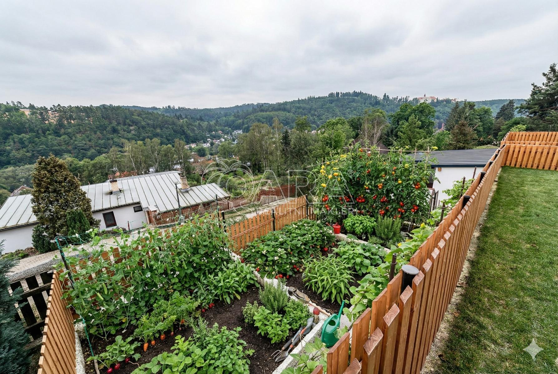 Není to jen pozemek. Je to zahrada navržená zahradním architektem, kde najdete nově vysazené ovocné stromy, okrasné keře a připravený skleník pro vaše pěstitelské radosti. Borovicová pergola a zděný zahradní domek (45 m2) s letní kuchyní a dílnou přímo vybízejí k letním oslavám nebo kutilským projektům.