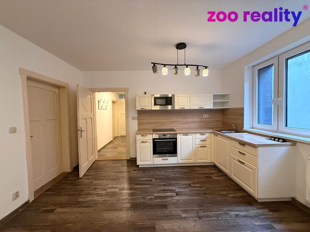 Nachází se zde předsíň, zděné koupelnové jádro se sprchovým koutem, umyvadlem a toaletou, komora ve které je prostor na pračku, kuchyň s kuchyňskou linkou a prostorem pro jídelní část. Dále zde najdeme dva samostatné pokoje. Vytápění a ohřev vody je zajištěno plynovým kotlem. K bytu náleží velká sklepní kóje a lze využívat zahradu za domem.