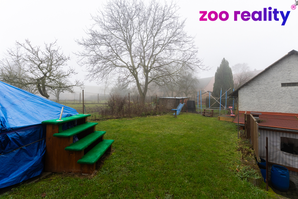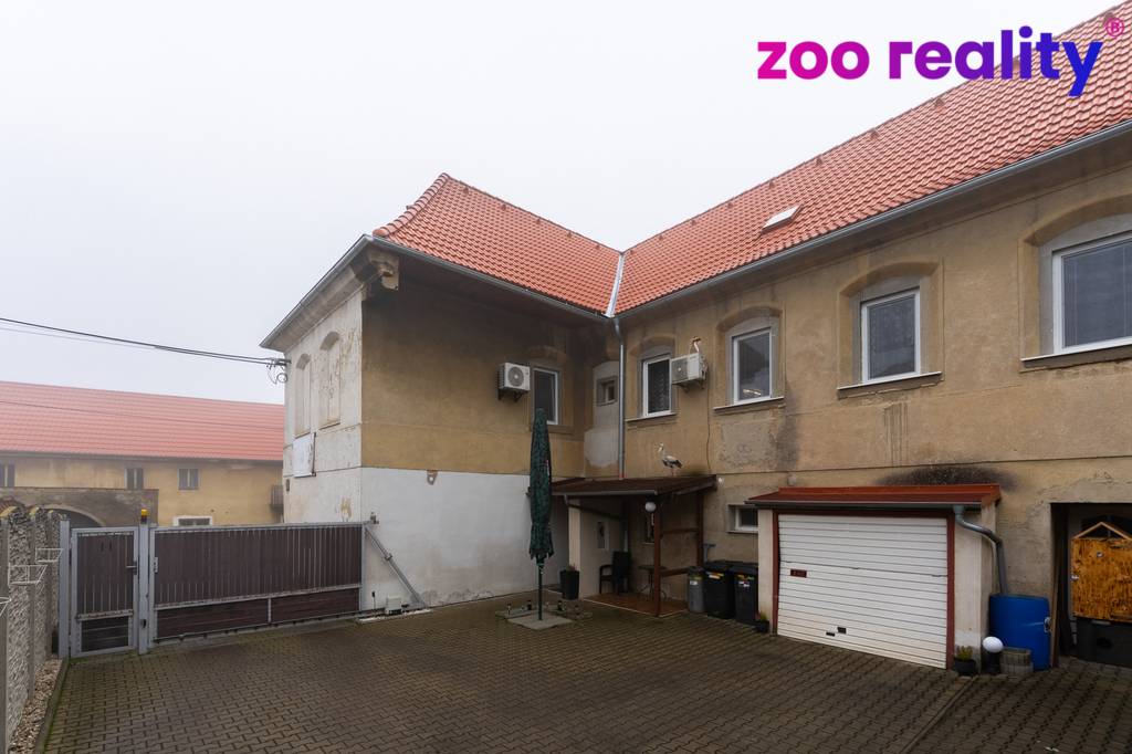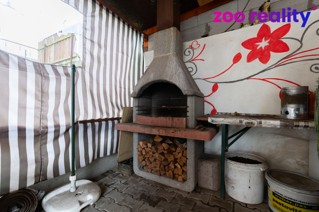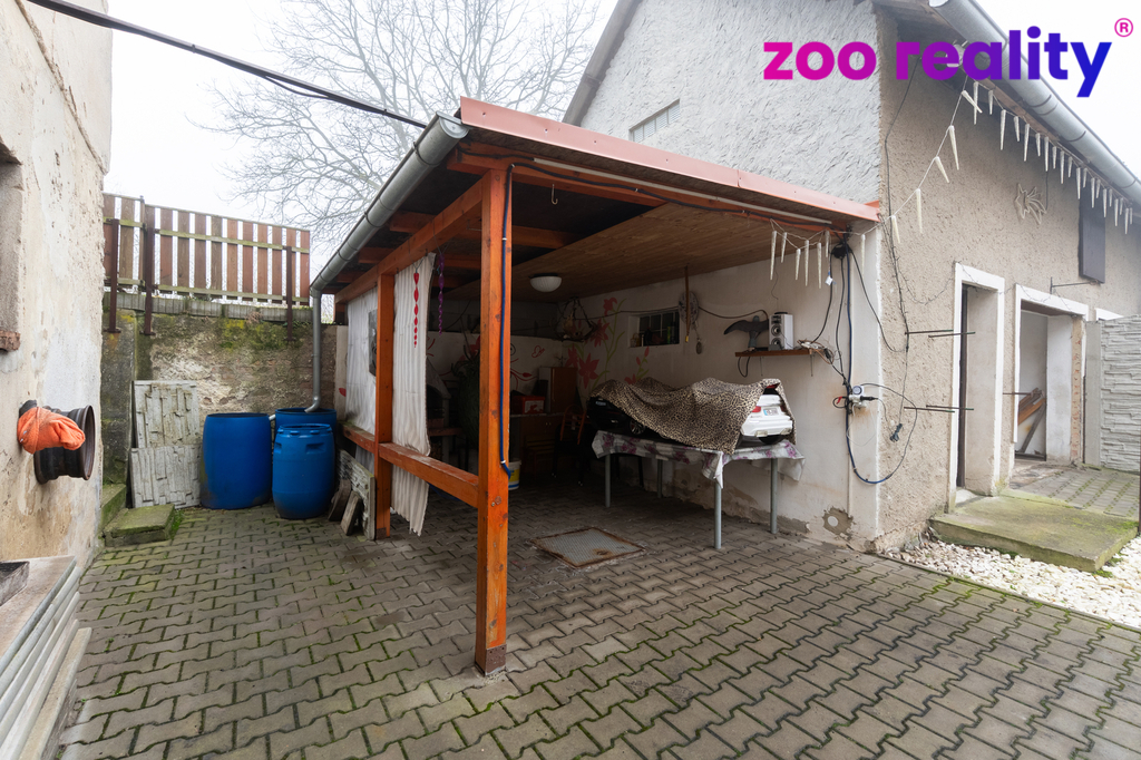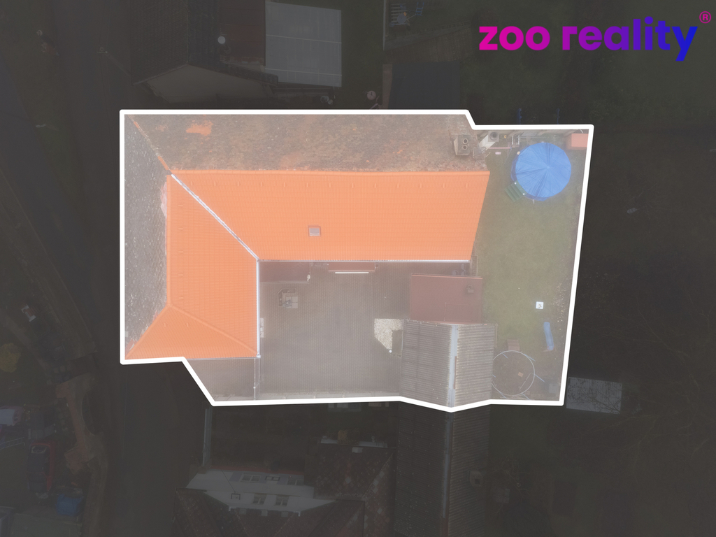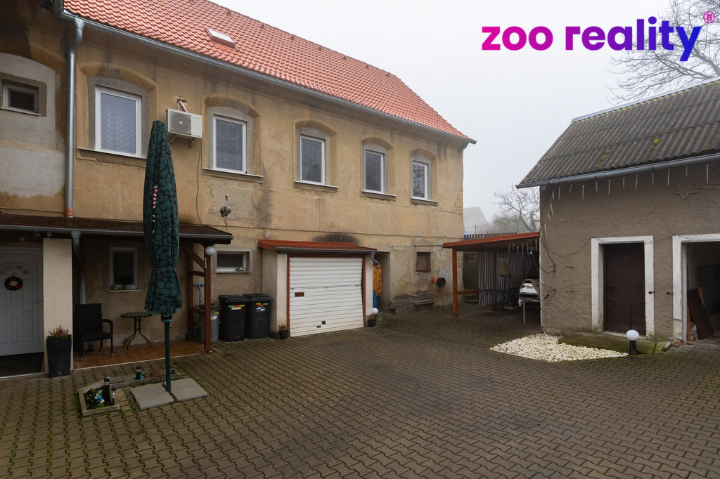 Před domem se nachází dlážděný dvůr s pojezdovou bránou, další garáž, malá dílna a kryté posezení s venkovním grilem. Nad domem je příjemná zahrádka, ideální pro dětské hry, relaxaci nebo posezení na čerstvém vzduchu.