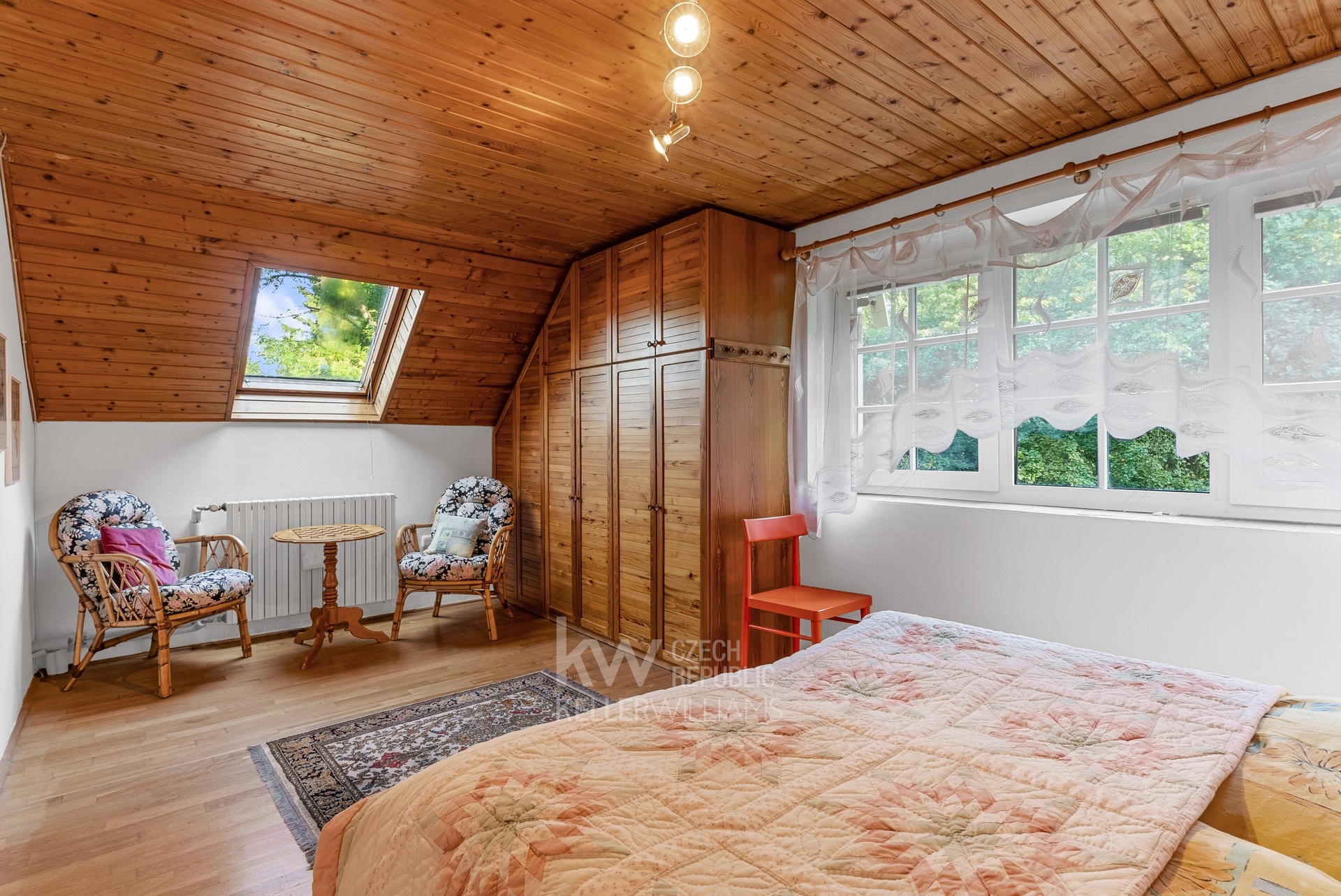 Podkroví: Pokoj s krbovými kamny, pokoj a koupelna se sprchovým koutem a WC.