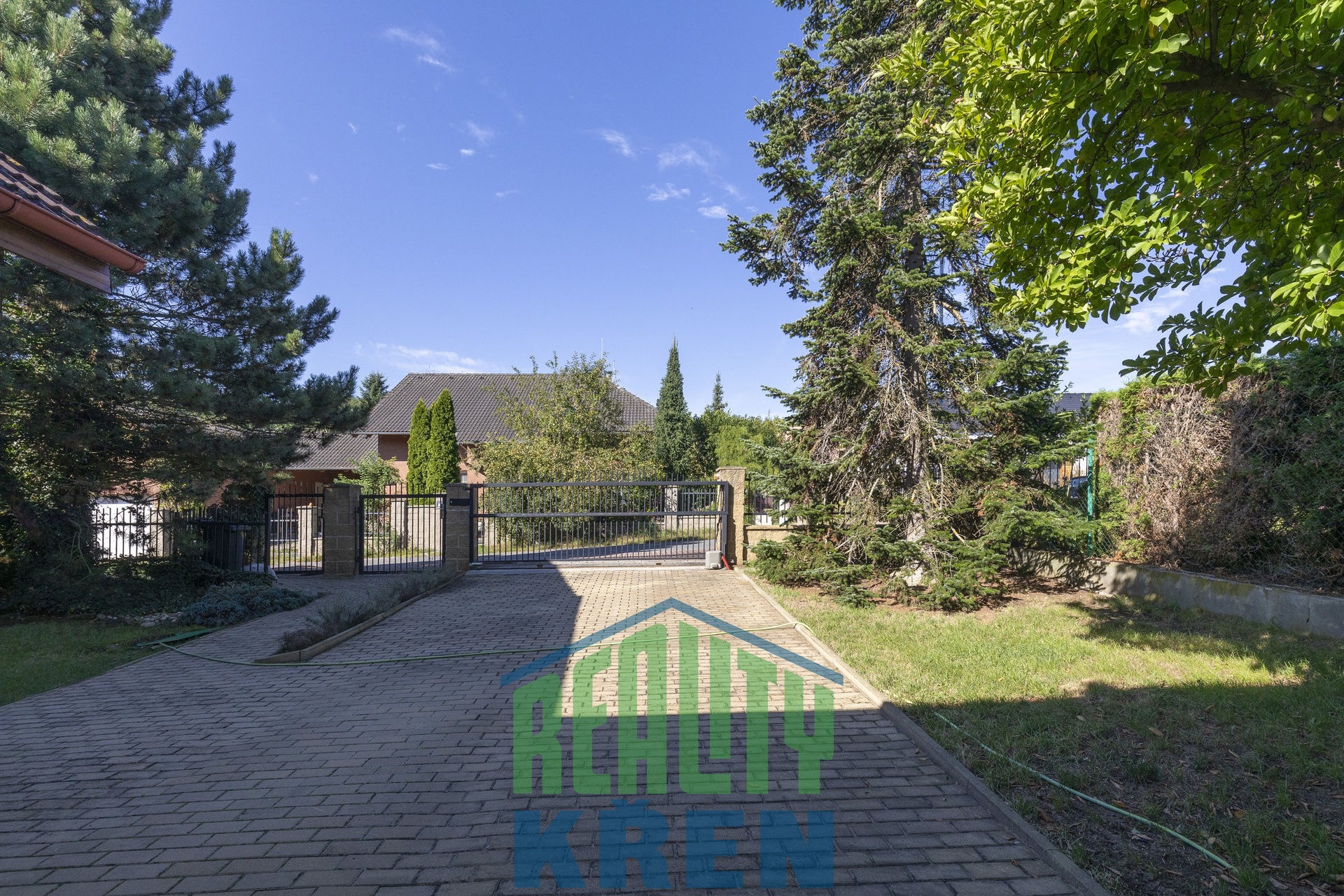 Dům je připojen na všechny inženýrské sítě a kanalizaci, navíc má vlastní vrtanou studnu a velkou jímku 16m3 na dešťovou vodu pro zalévání zahrady. Vzrostlá zahrada okolo domu o velikosti 934m2 byla navržena architektem, v zahradě je zabudován automatický zavlažovací systém. Na pozemku u domu je dostatek místa pro zaparkování 2 až 3 osobních automobilů, celý pozemek je oplocen a vjezd z obecní komunikace je zajištěn pojezdovou bránou.