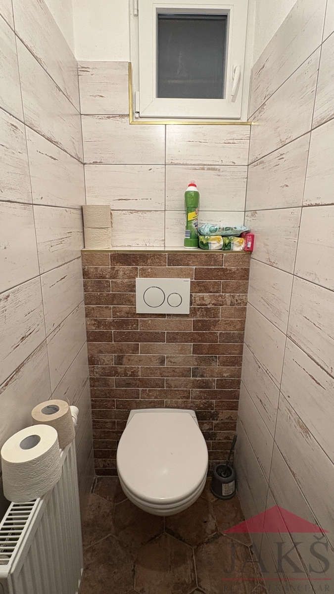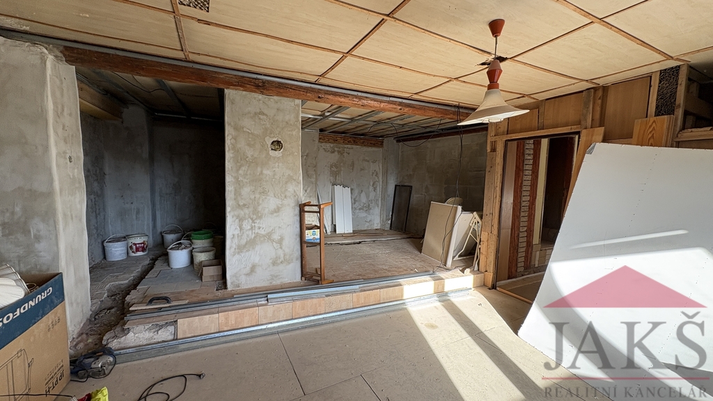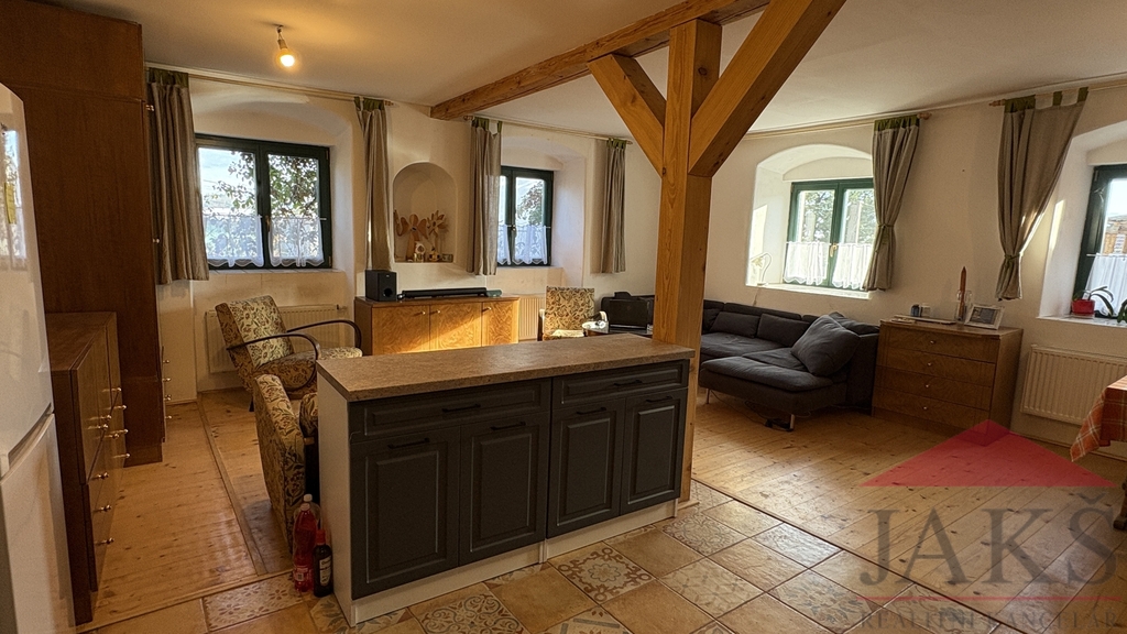 Popis: vstup skrze zastřešenou dřevěnou verandu s posezením; 1.NP: předsíň se schodištěm do 2.NP, komora, sam. WC, stylová koupelna (vana, umyv. se zrcadlem a skříňkou, topný žebřík), prostorný obývací pokoj 40 m2 s dřevěnou podlahou, jídelnou, kuch. koutem (stylová rohová kuch. linka s HV troubou, plynovými hořáky) a sporákem na T.P. s výměníkem, ložnice; 2.NP: podesta, prostorný pokoj 40 m2 s původní zbroušenou dřevěnou podlahou, nedokončená ložnice a koupelna.