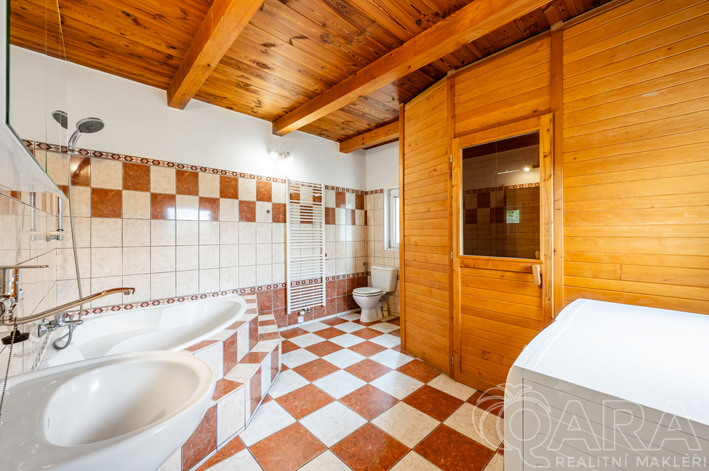 V přízemí najdete prostorný obývací pokoj se západní orientací, krbovými kamny a přímým vstupem do zahrady, velkorysou plně vybavenou kuchyni v přírodním designu a koupelnu s vanou, saunou a toaletou. Samozřejmostí je i technické zázemí.