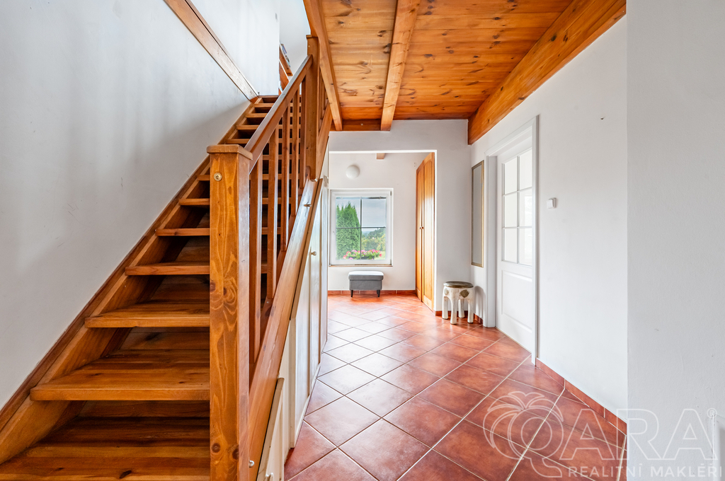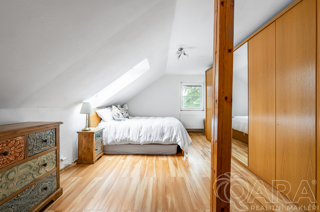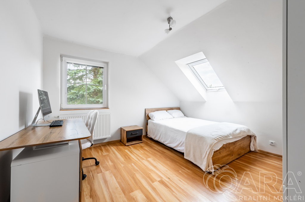 V patře jsou tři neprůchozí pokoje – hlavní pokoj (aktuálně využívaný jako pracovna, knihovna a pokoj pro hosty), dále ložnice a dětský pokoj. V prostoru u schodiště je navíc šikovně řešený pracovní kout.