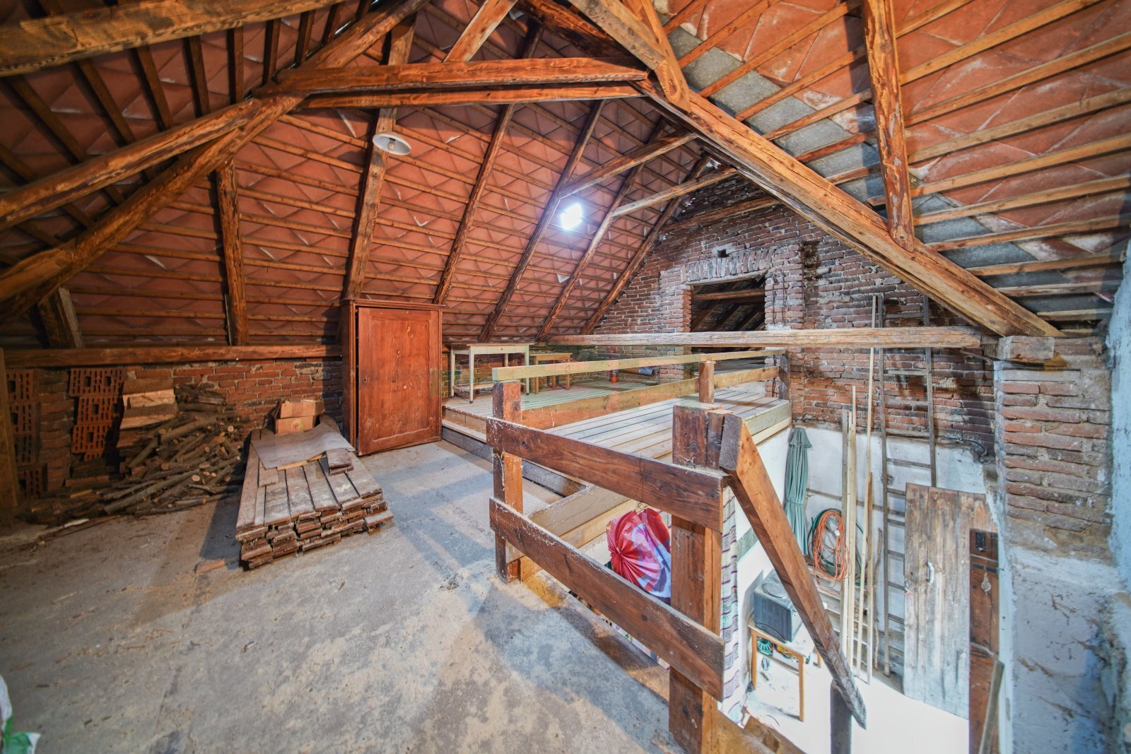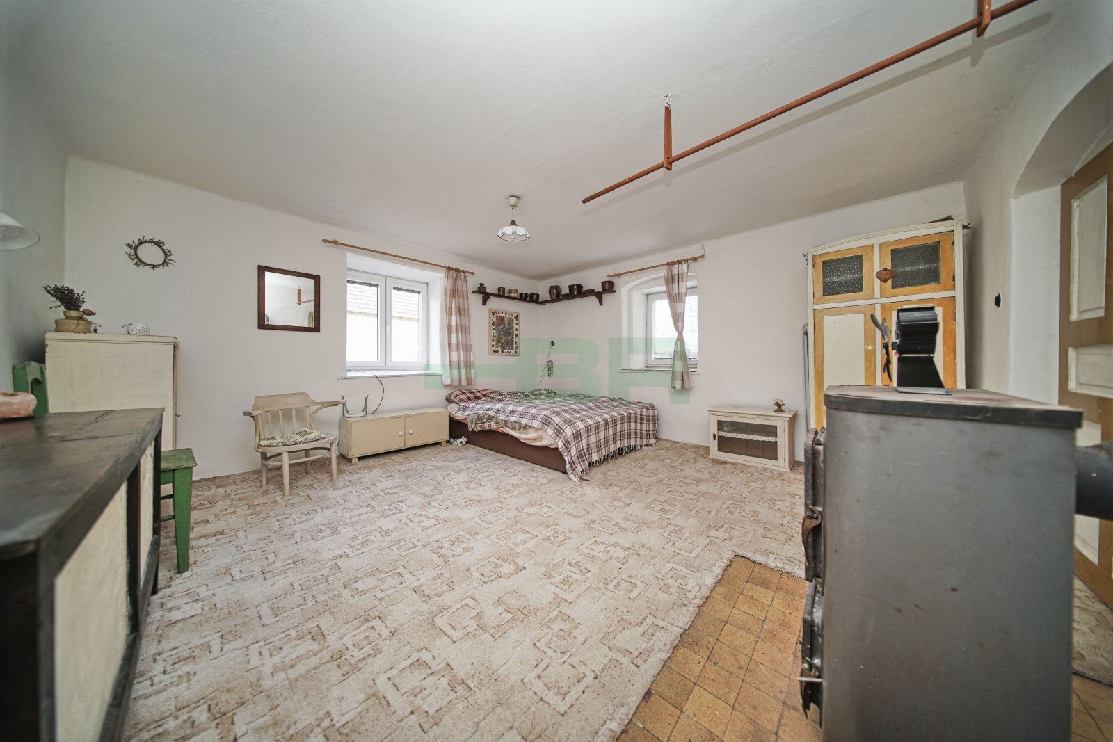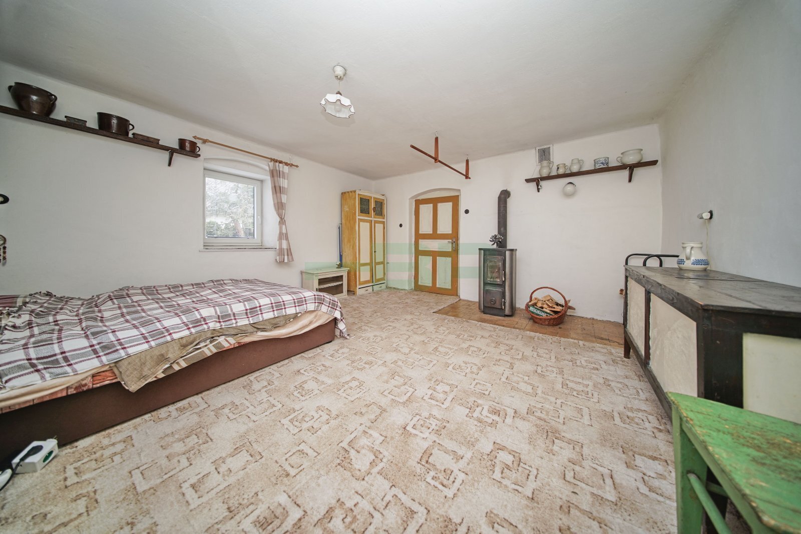 Obývací pokoj 19,3 m2, ložnice 16,2 m2, kuchyňský kout 4,8 m2, koupelna 7,7 m2, předsíň 5,1 m2 a WC 1,1 m2. Dále tři technické místnosti v přízemí 90 m2, půdní pokoj 30 m2 a pochozí půda.