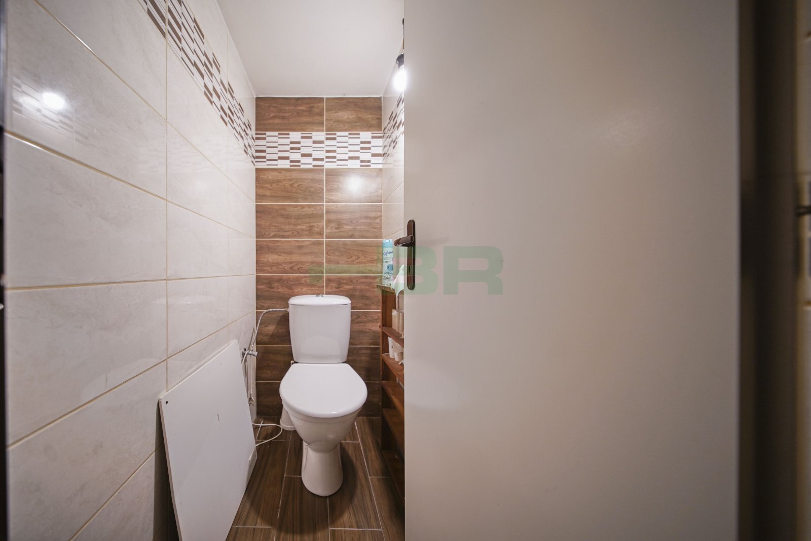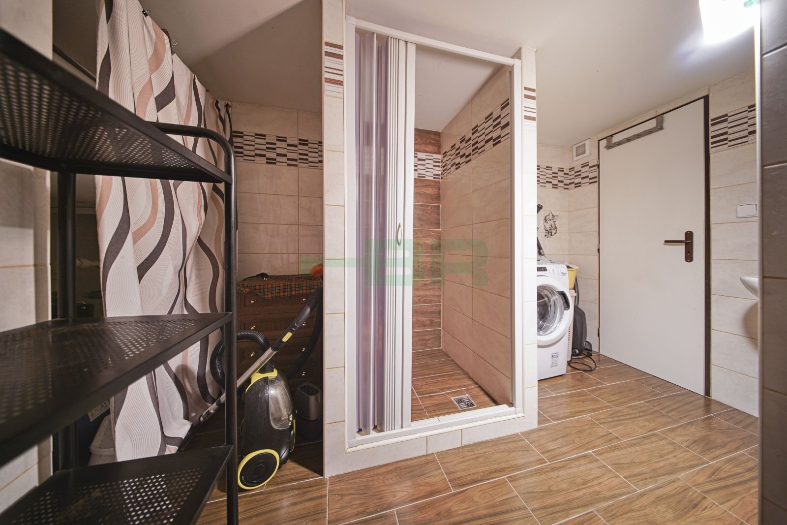 Na podlahách koberce a dlažba. Na podlahách koberce a dlažba. Velká koupelna se sprchovým koutem a pračkou, WC oddělené.