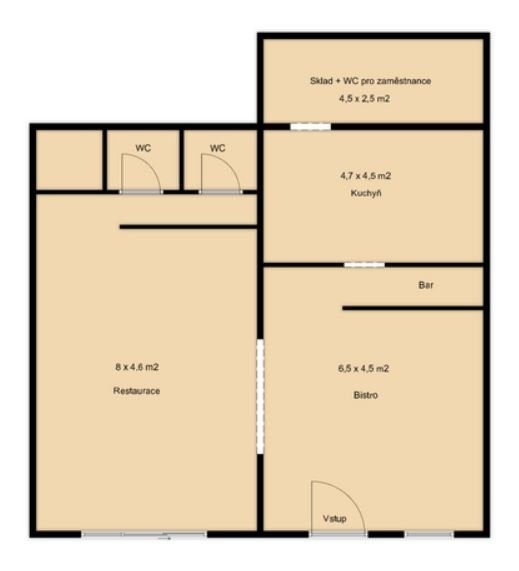 Bistro má dvě hlavní místnosti, WC pro klienty je rozděleno na dámské a pánské. Za barem je vstup do kuchyně a z kuchyně dále do menšího skladu a na samostatné WC pro personál.